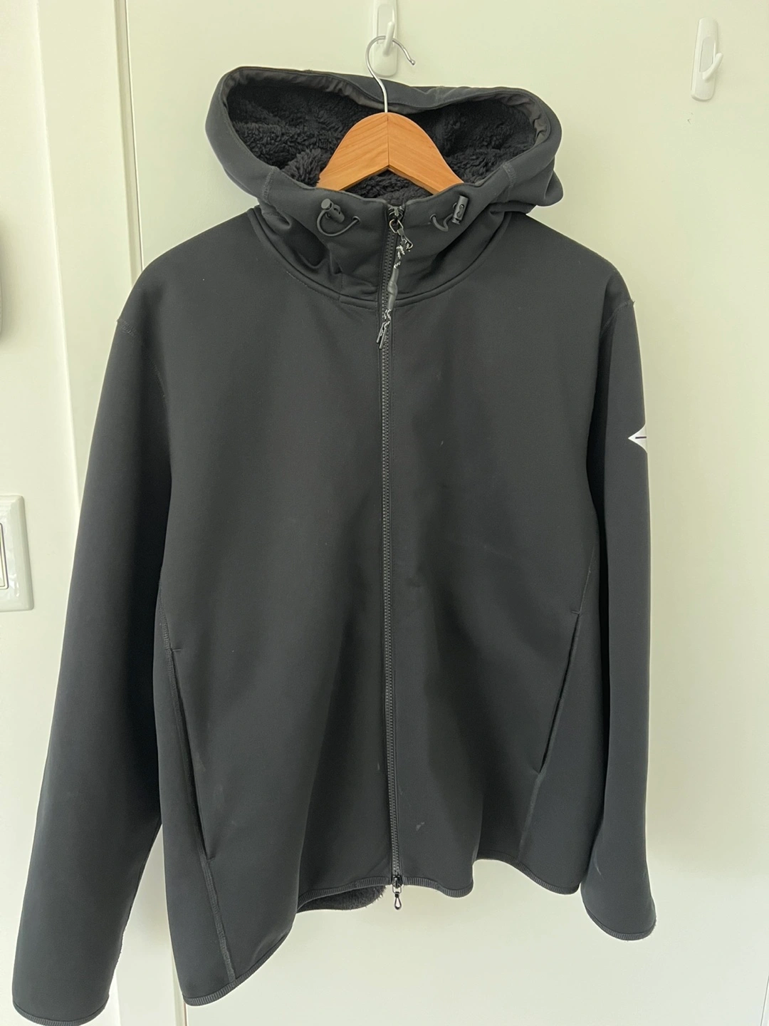 Black hooded jacket with fleece lining. Full zip closure and two pockets. Size Large. Zipper is double ended, jacket has a full hood. Warm and water resistant.