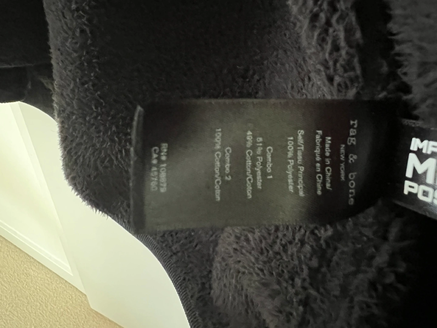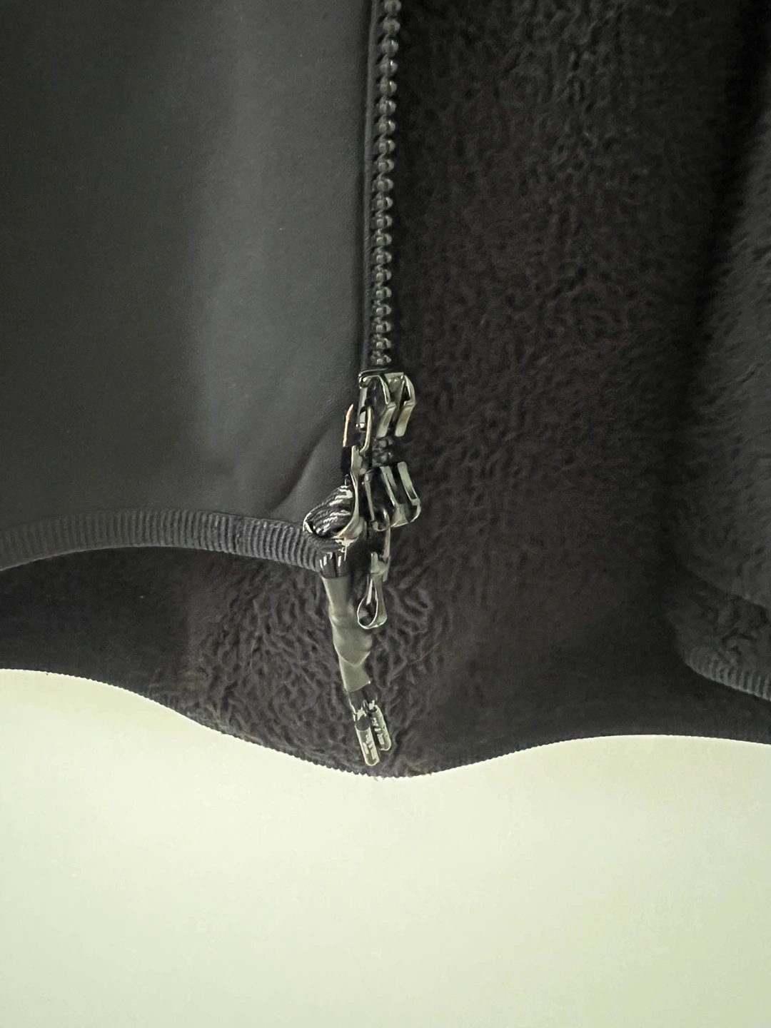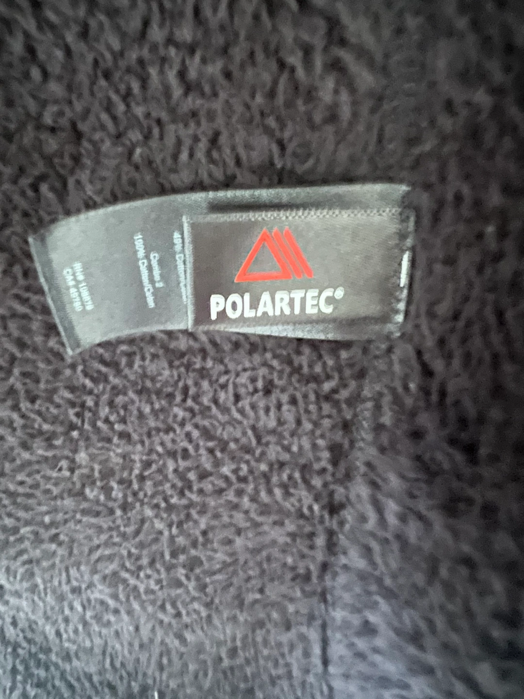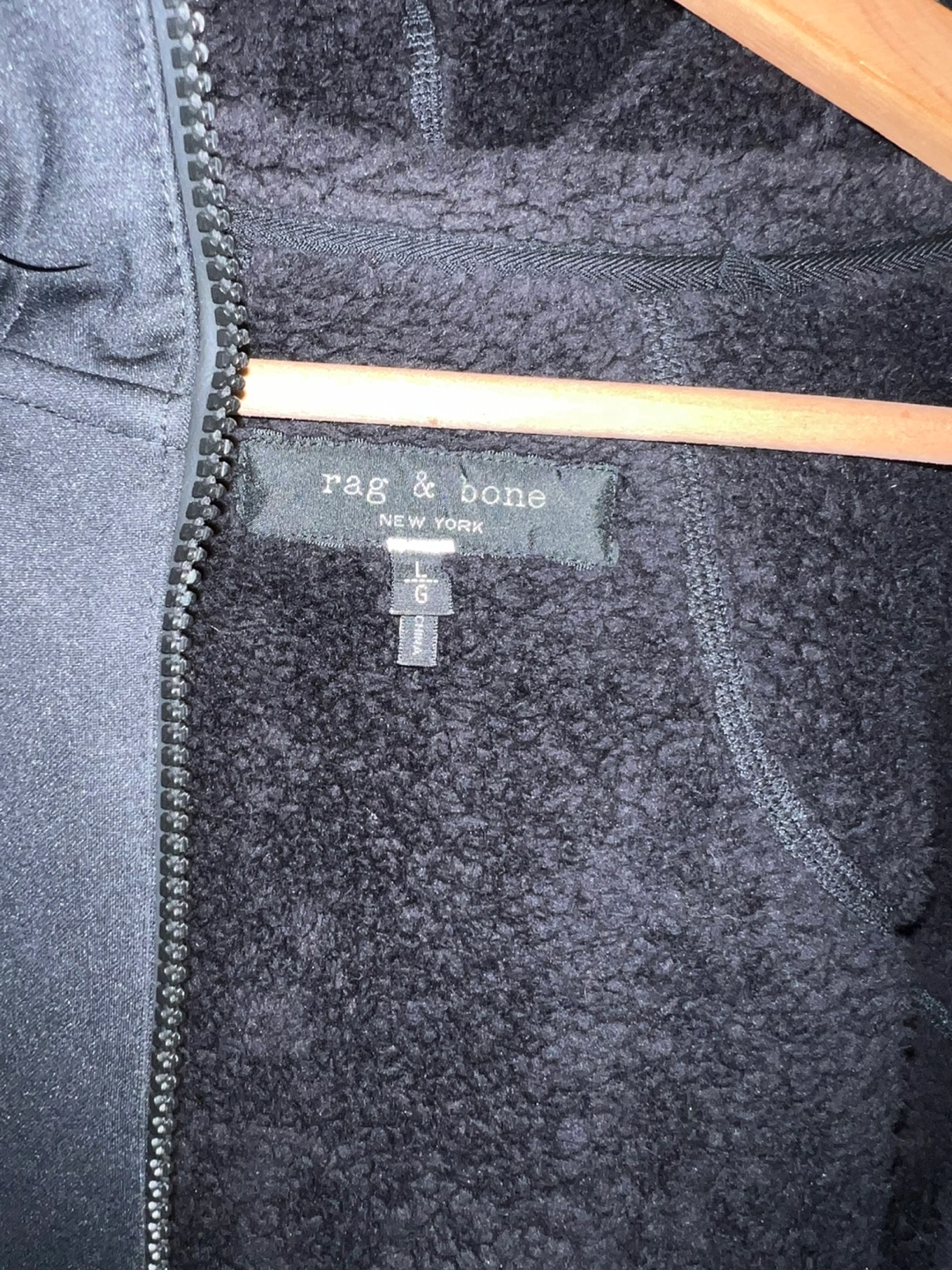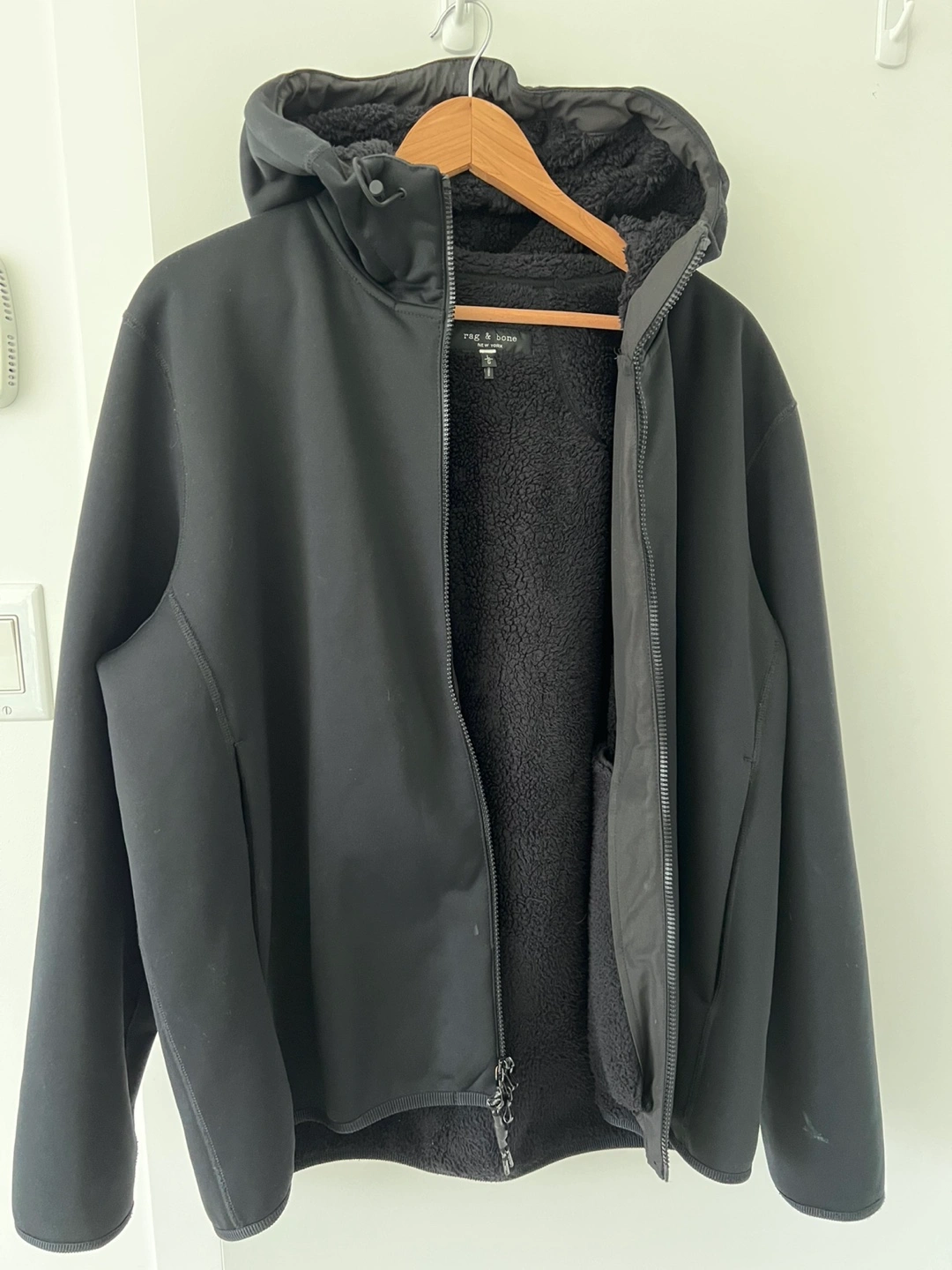 Black hooded jacket with fleece lining. Full zip closure and two pockets. Size Large. Zipper is double ended, jacket has a full hood. Warm and water resistant.