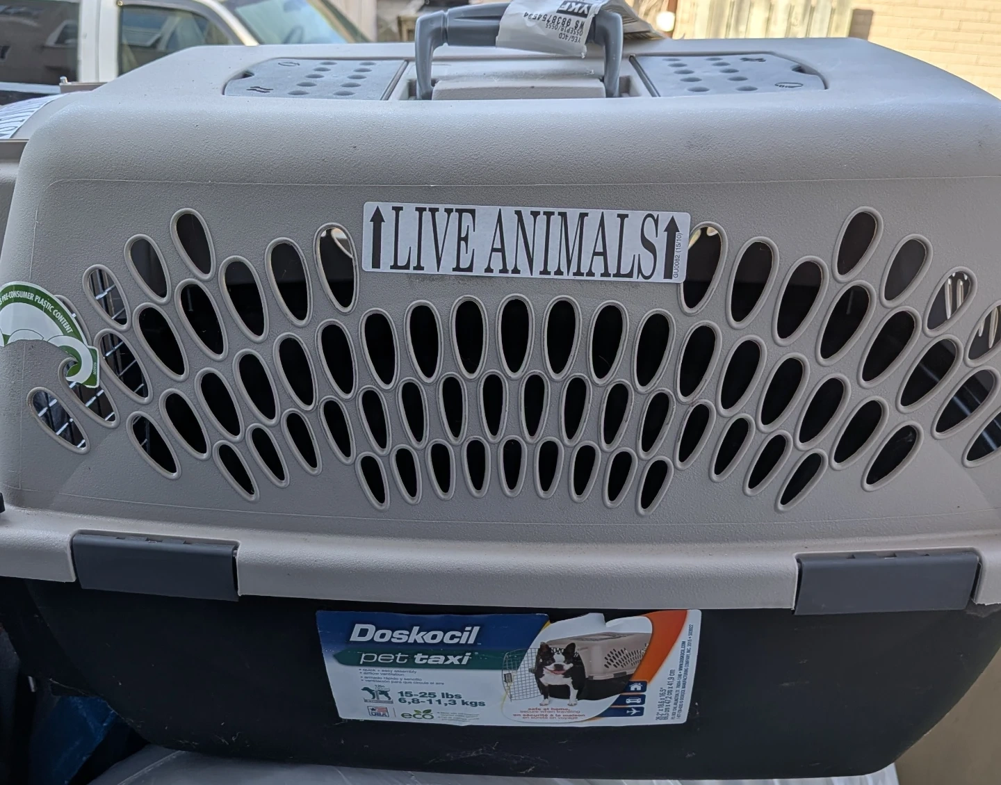 This is a Doskocil pet taxi carrier designed for pets weighing 15-25 lbs. It's made with plastic and features ventilation. Includes 'LIVE ANIMALS' sticker.