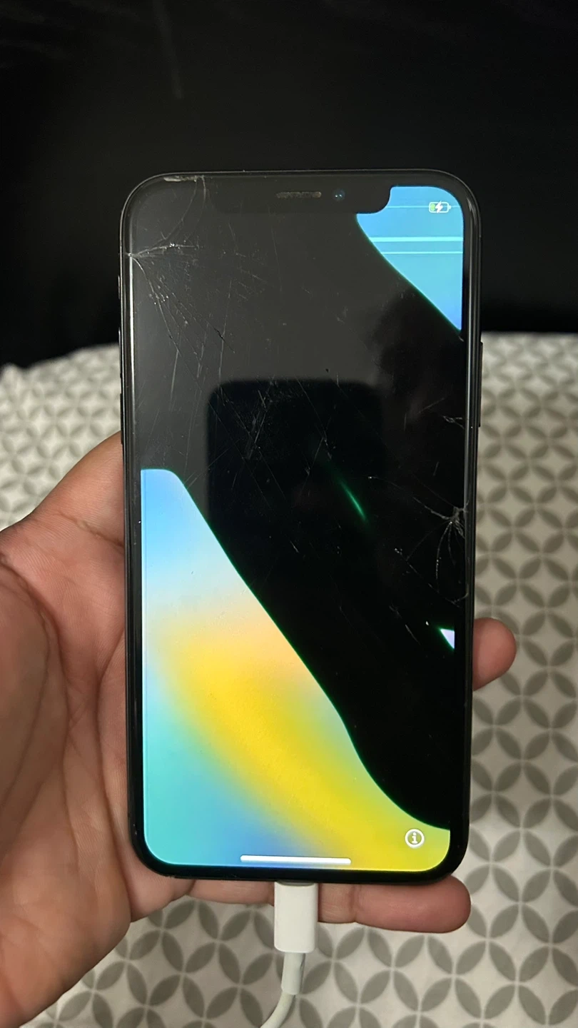 iPhone X 64GB for sale. Phone powers on and charges, but screen is damaged and not fully usable.