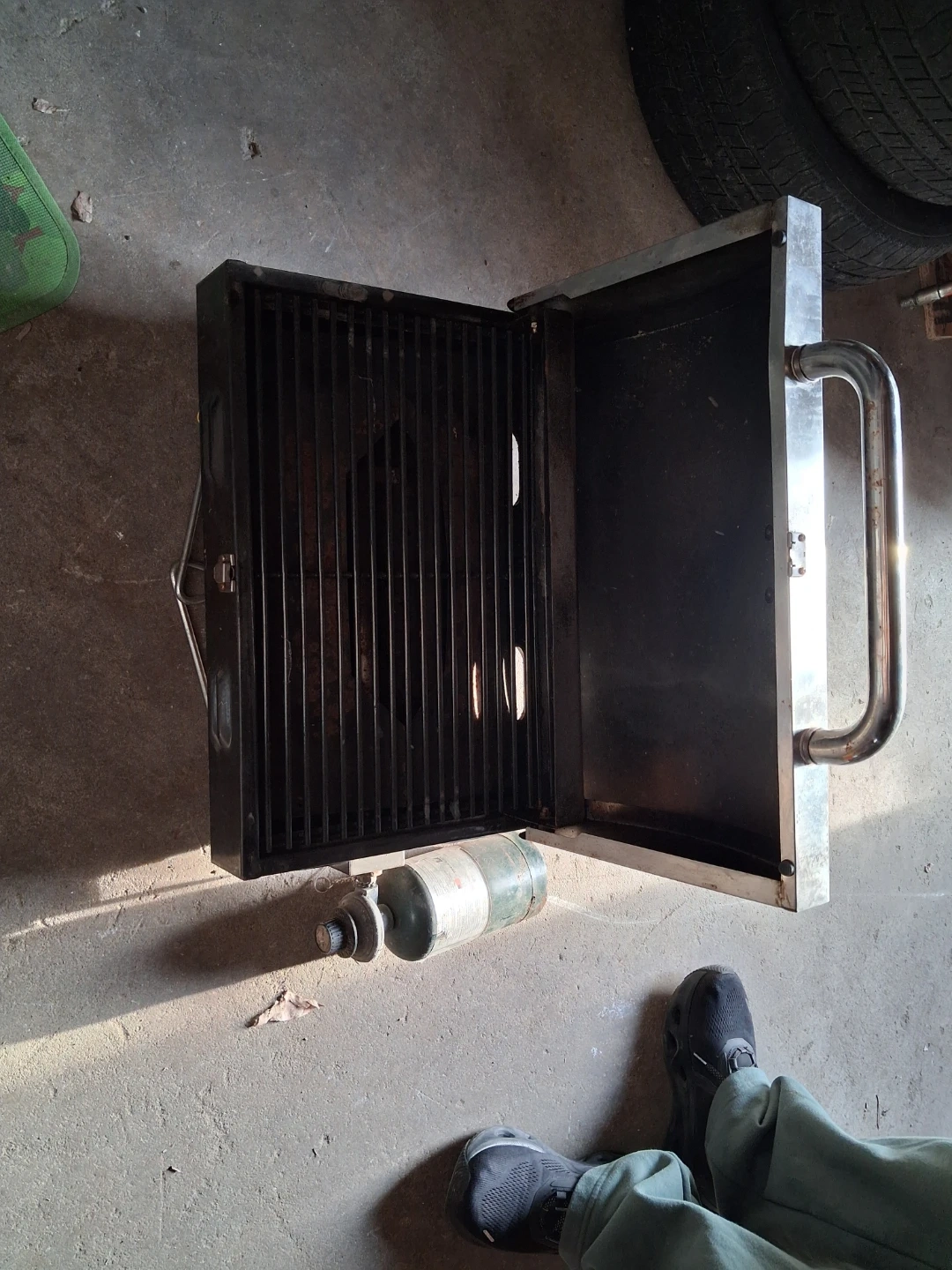 This Charmglow portable grill is great for outdoor cooking. It's a propane-powered unit with a stainless steel body. The grill includes a propane tank and a removable griddle.
