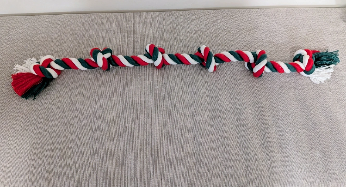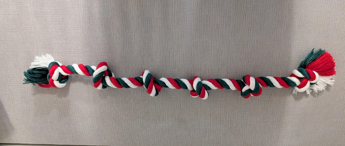 A festive dog rope toy in red, white, and green colours. It's made from durable rope with knots for added fun. Perfect for chewing and playing fetch!