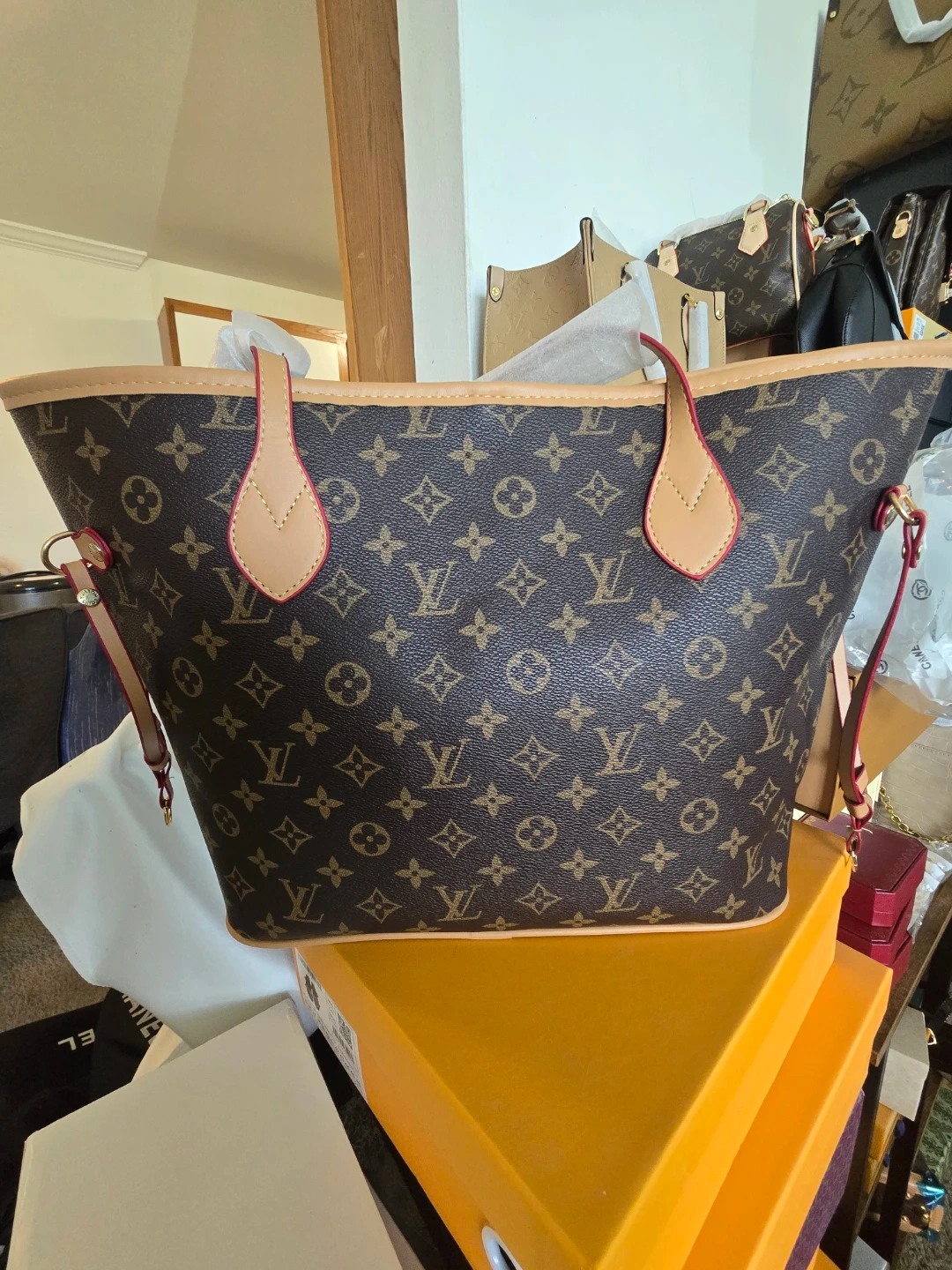 This Louis Vuitton tote bag features the iconic monogram canvas. It has leather trim and handles. It's a stylish everyday carryall!