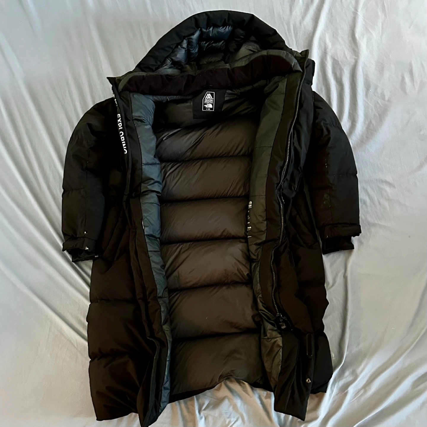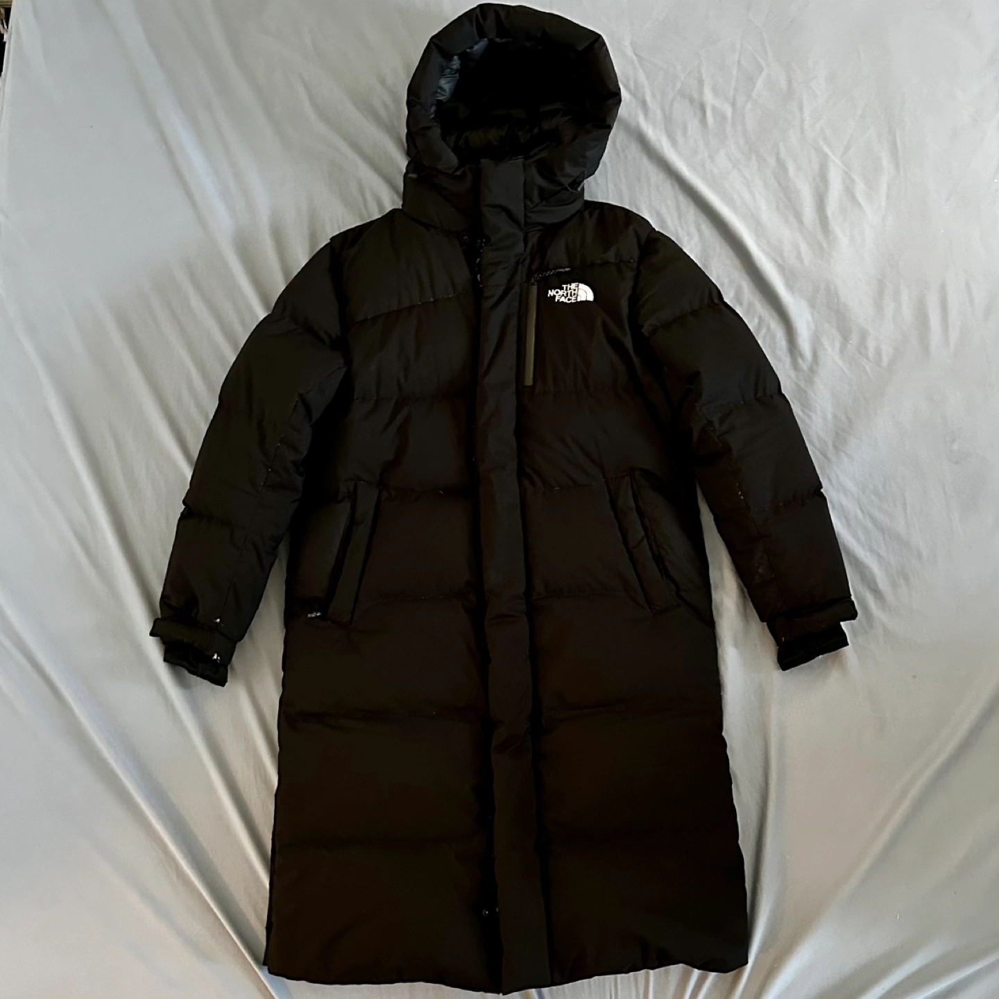 This is a large premium long down coat imported from Korea, featuring RDS-certified 80% duck down and 20% duck feather insulation for ethical warmth and comfort. Perfect for cold weather. Used, with minor wear (small rips from regular use) that do not affect performance. Priced accordingly–MSRP is ₩399,000 which is about $395.96.