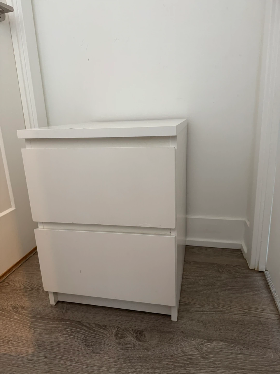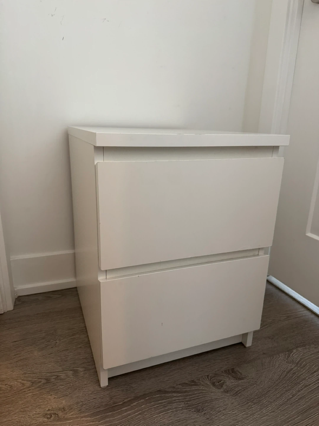 A white two-drawer nightstand. It's a simple and functional piece for your bedroom. This nightstand provides convenient storage space. Perfect for holding essentials for your bed!