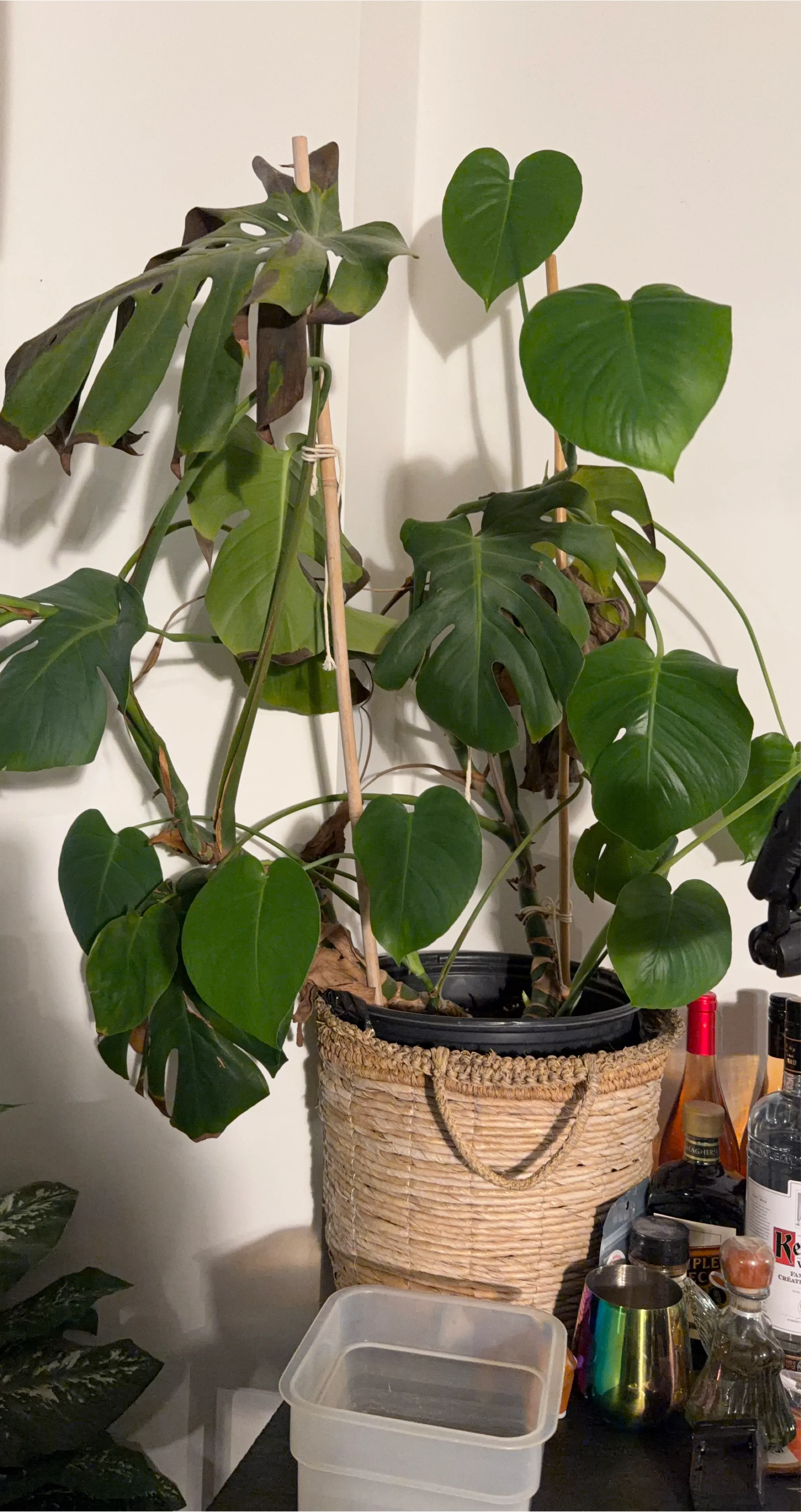 Selling a monstera plant in a cute woven basket! It's got beautiful, vibrant leaves and is ready to brighten up your space