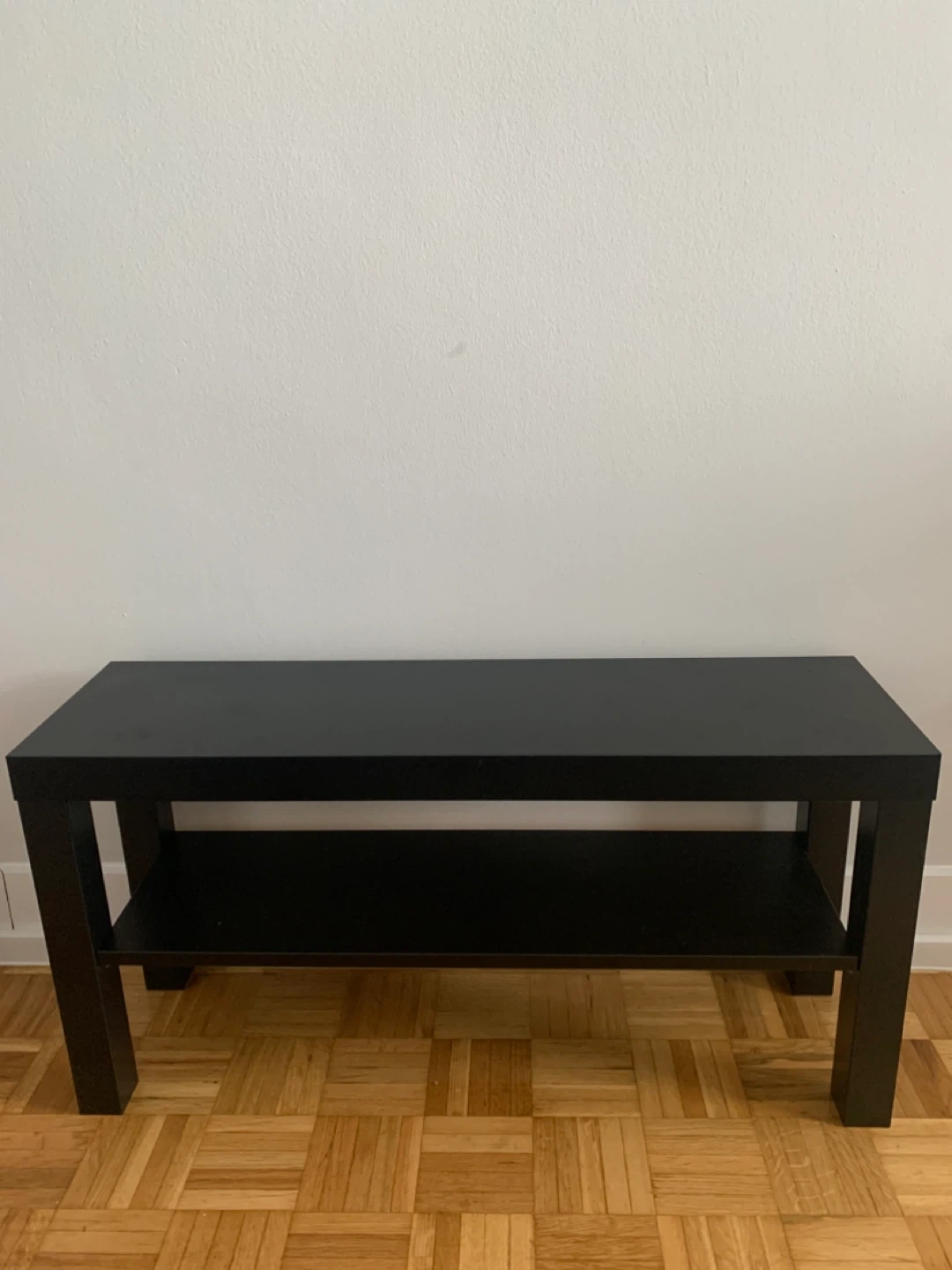 Black TV stand with an open shelf for storage. It measures 34 1/2 inches wide. This unit is made of particleboard with a black laminate finish. It's a good size for smaller living spaces.
