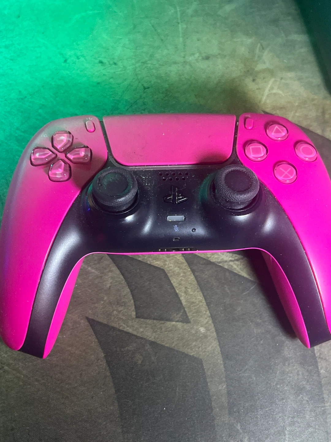 This is a pink DualSense wireless controller for the PlayStation 5. It features a comfortable grip and responsive buttons for an immersive gaming experience. The vibrant pink colour makes it stand out!