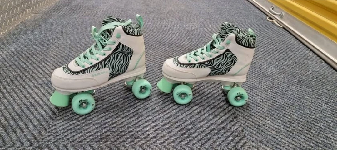 Here are some Roller Derby roller skates in a size 7! They are white with a zebra print and mint green wheels and laces. They are in good condition and ready to roll!