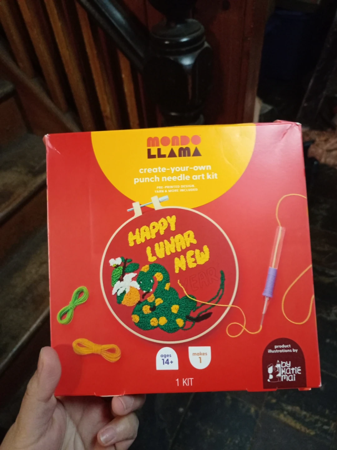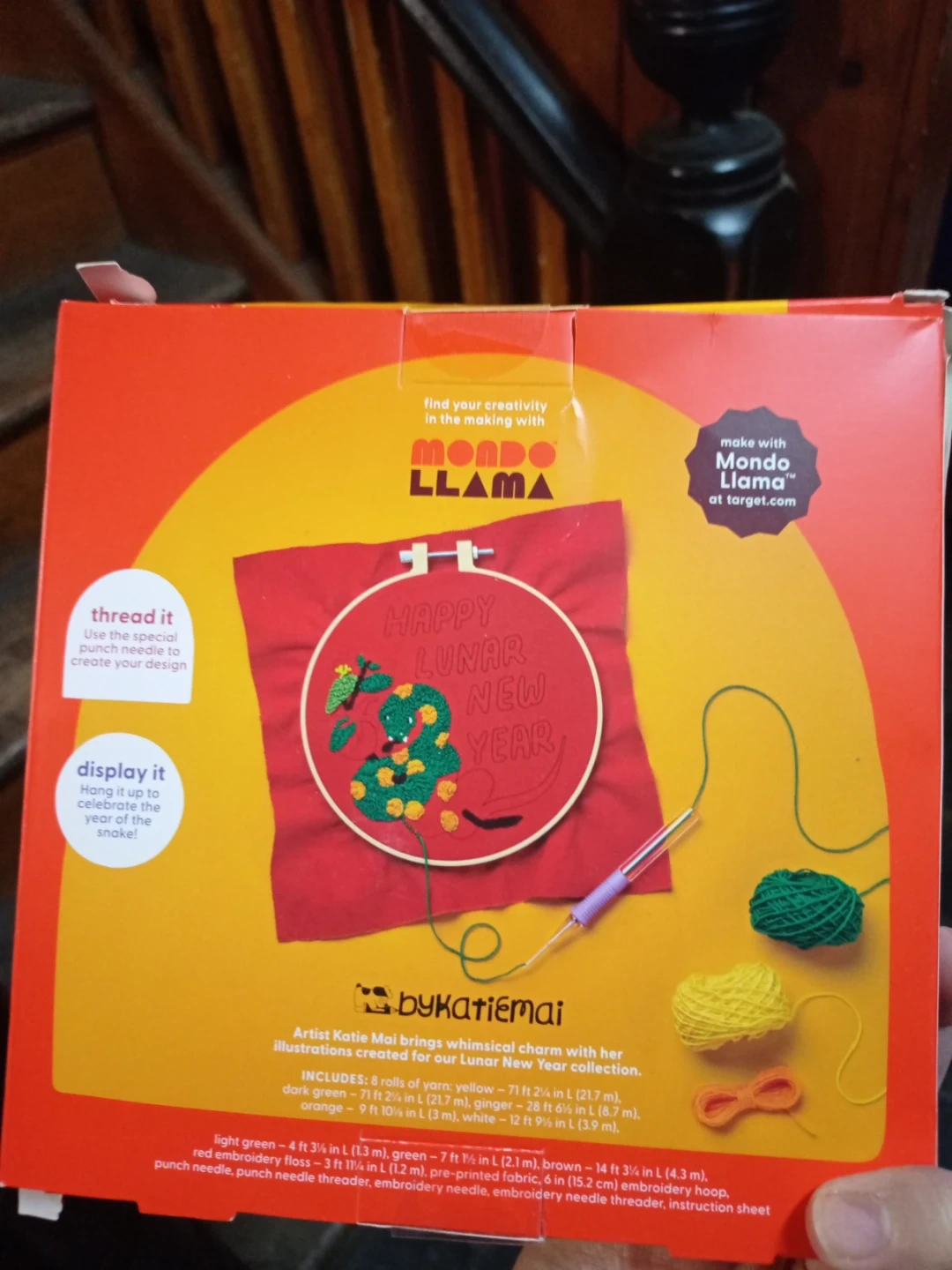 This Mondo Llama punch needle art kit lets you create a 'Happy Lunar New Year' snake design. It includes embroidery floss in multiple colors, a punch needle, threader, and instruction sheet. It's designed for ages 14 and up.