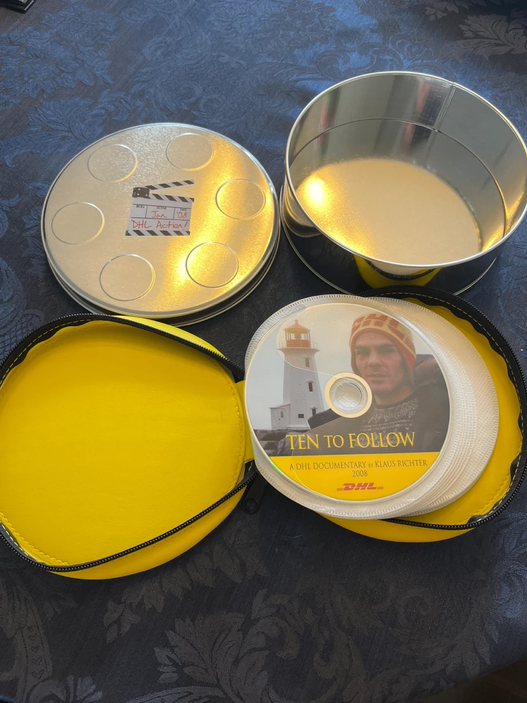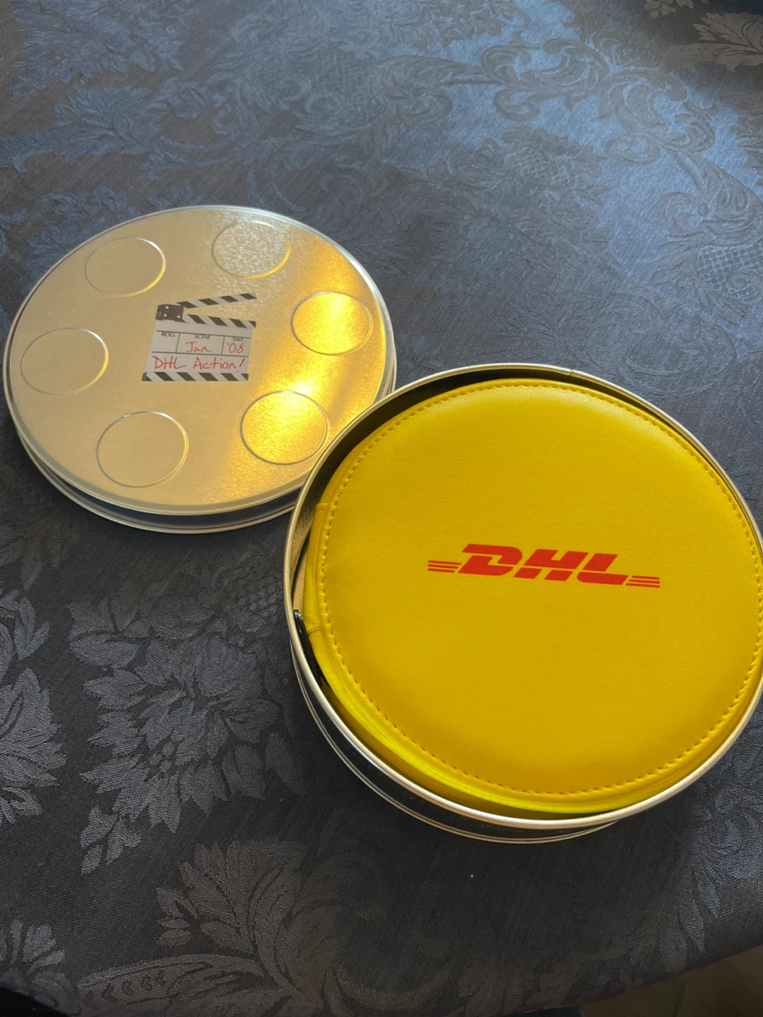 I'm offering a DHL film tin, complete with a set of CDs. This unique collectible includes a metal film canister adorned with DHL branding, adding a touch of cinematic flair to your collection. The CDs inside are also DHL-themed, making this a must-have for any DHL enthusiast or collector of unique memorabilia. This item is in used condition.