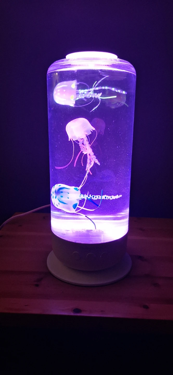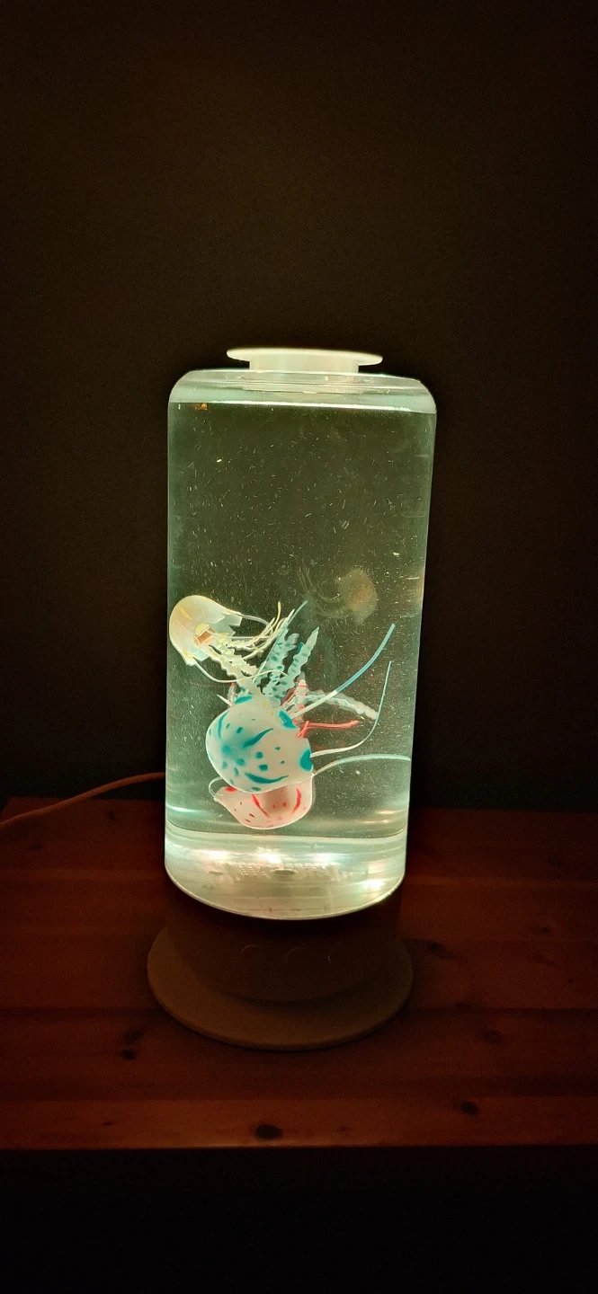This is a novelty jellyfish lamp. It has realistic artificial jellyfish that float and move in the water. The lamp provides a relaxing, ambient light. Uses a USB-C plug in that you'll need to supply yourself (like a phone charger). Generates white noise with floating jelly fish and changing colours. Cycles through different colours or can stay on one single colour. Water flow intensity can be changed as well.