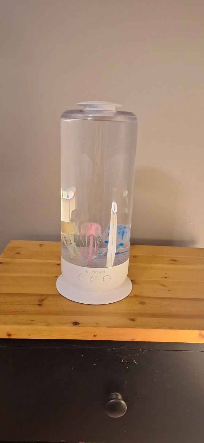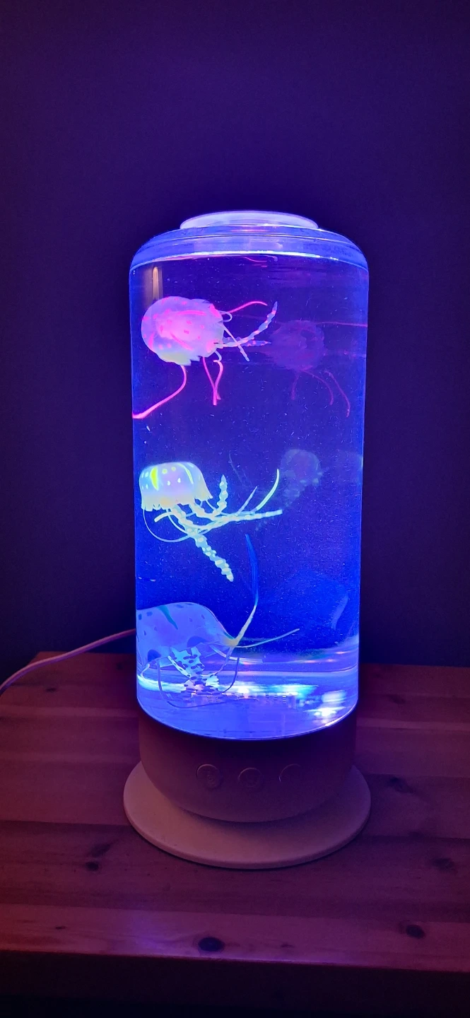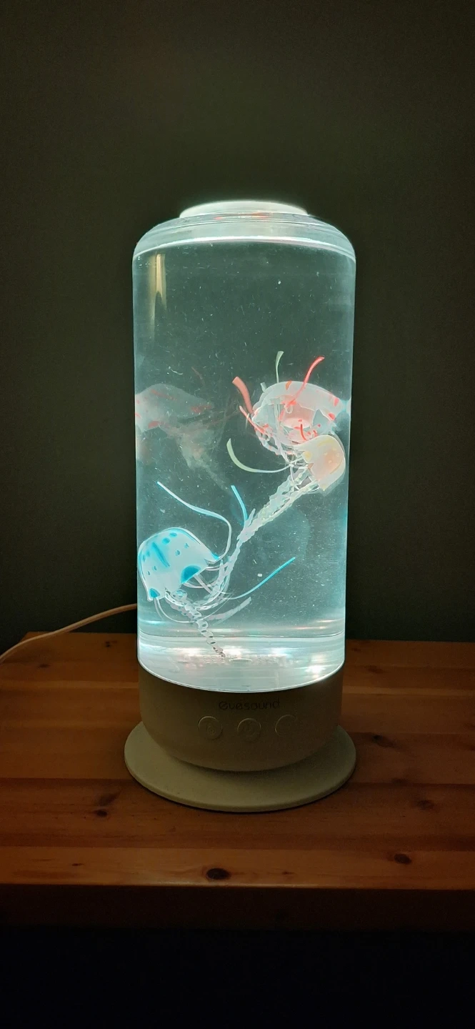 This is a novelty jellyfish lamp. It has realistic artificial jellyfish that float and move in the water. The lamp provides a relaxing, ambient light. Uses a USB-C plug in that you'll need to supply yourself (like a phone charger). Generates white noise with floating jelly fish and changing colours. Cycles through different colours or can stay on one single colour. Water flow intensity can be changed as well.