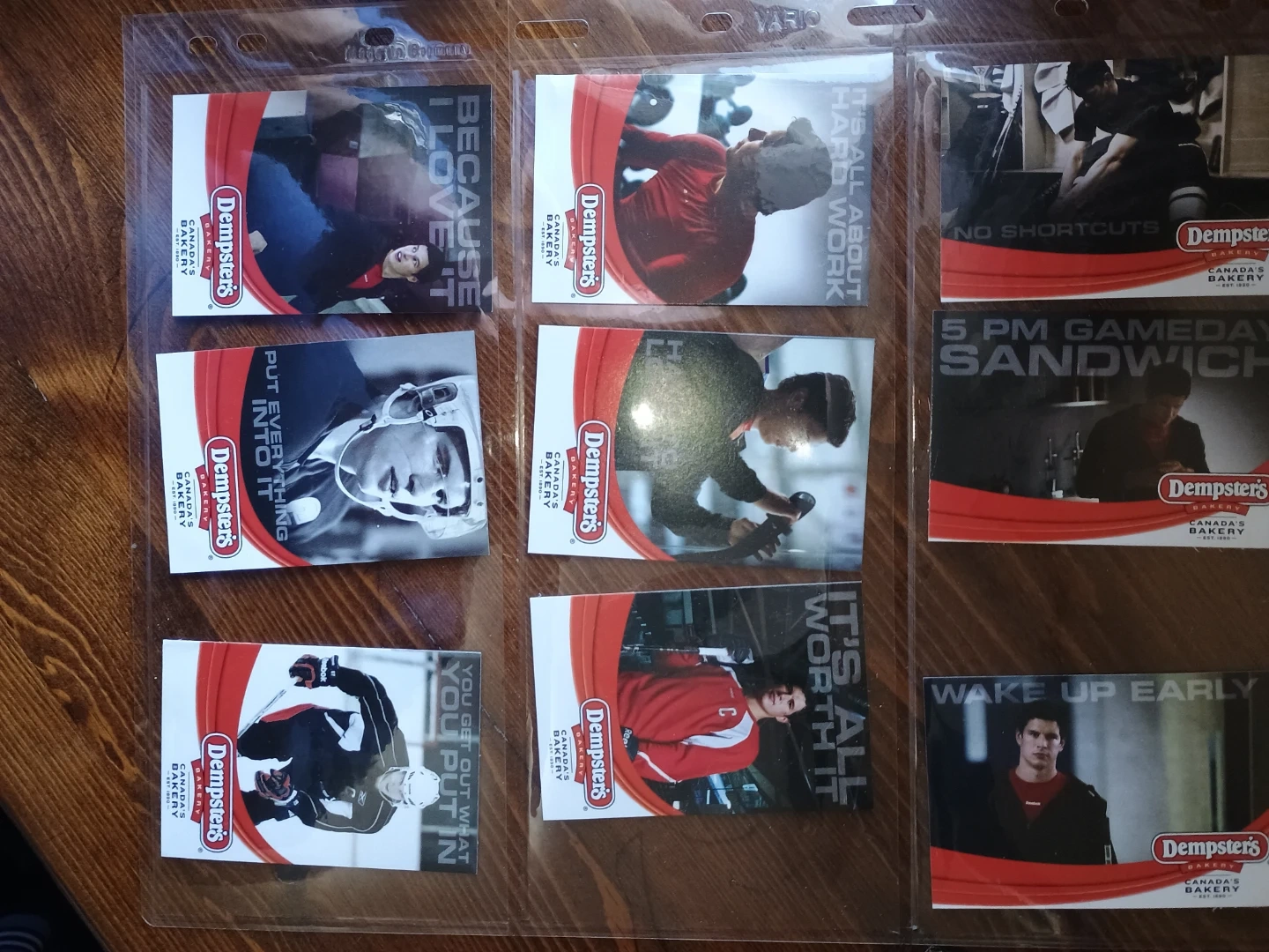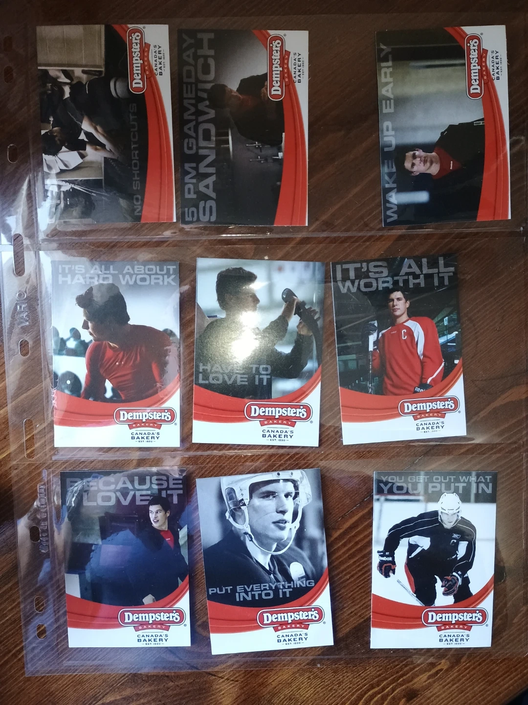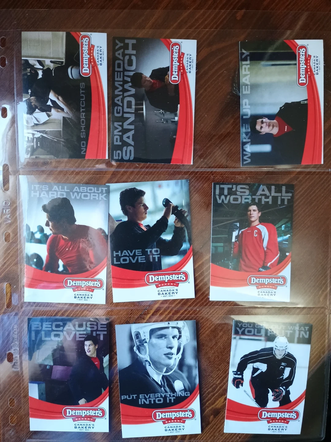 Collection of 9 Dempster's Sidney Crosby collector cards. Each card features a unique image and quote related to Sidney Crosby's career. These cards were part of a promotional campaign by Dempster's Canada's Bakery. They showcase different aspects of hard work and dedication. Perfect for hockey fans and collectors!