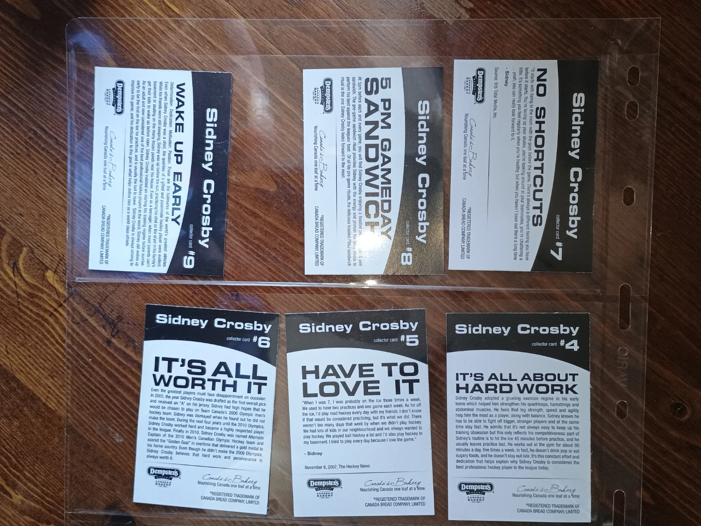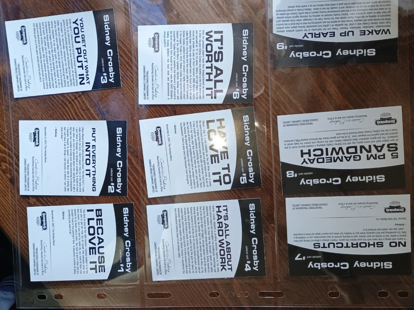 Collection of 9 Dempster's Sidney Crosby collector cards. Each card features a unique image and quote related to Sidney Crosby's career. These cards were part of a promotional campaign by Dempster's Canada's Bakery. They showcase different aspects of hard work and dedication. Perfect for hockey fans and collectors!