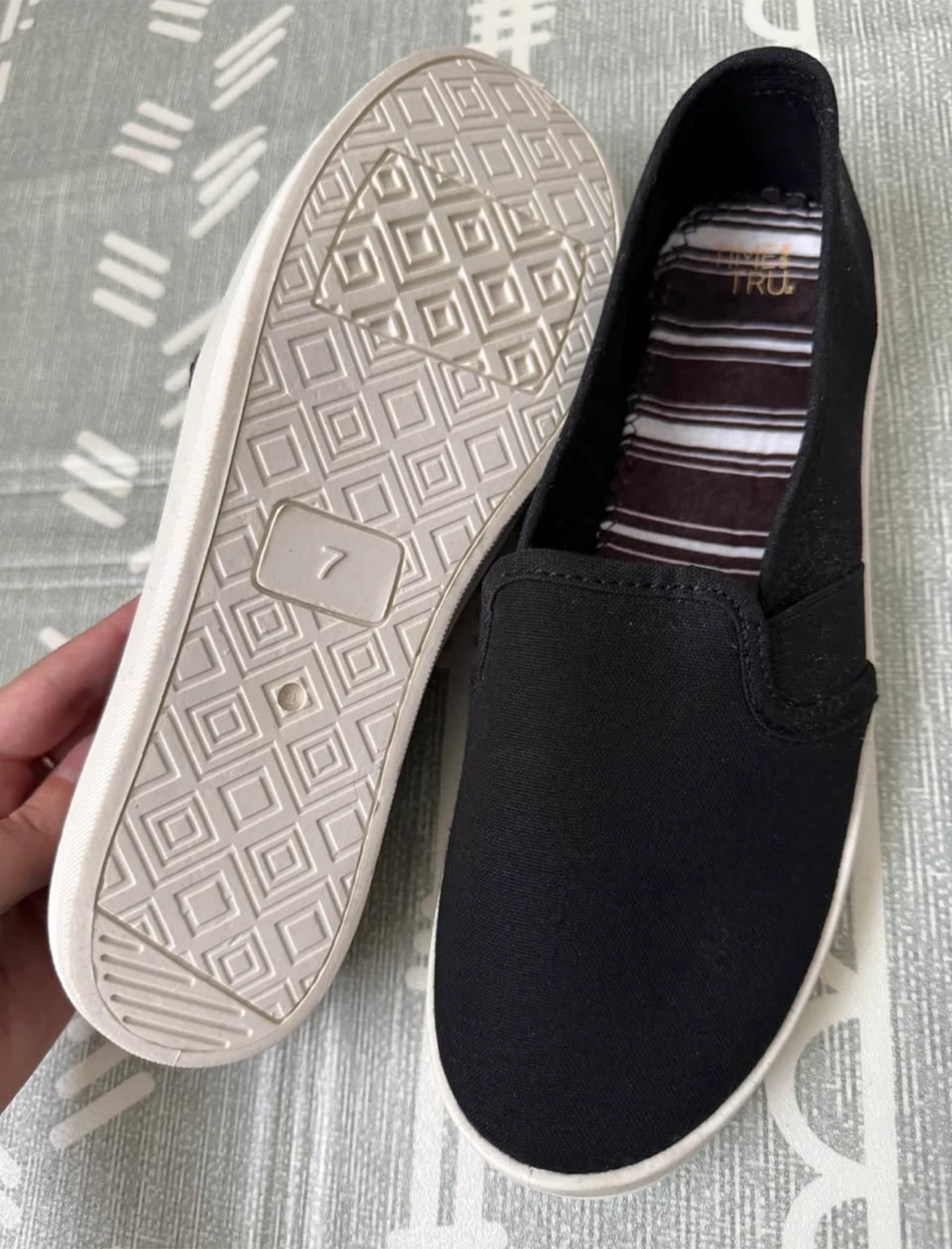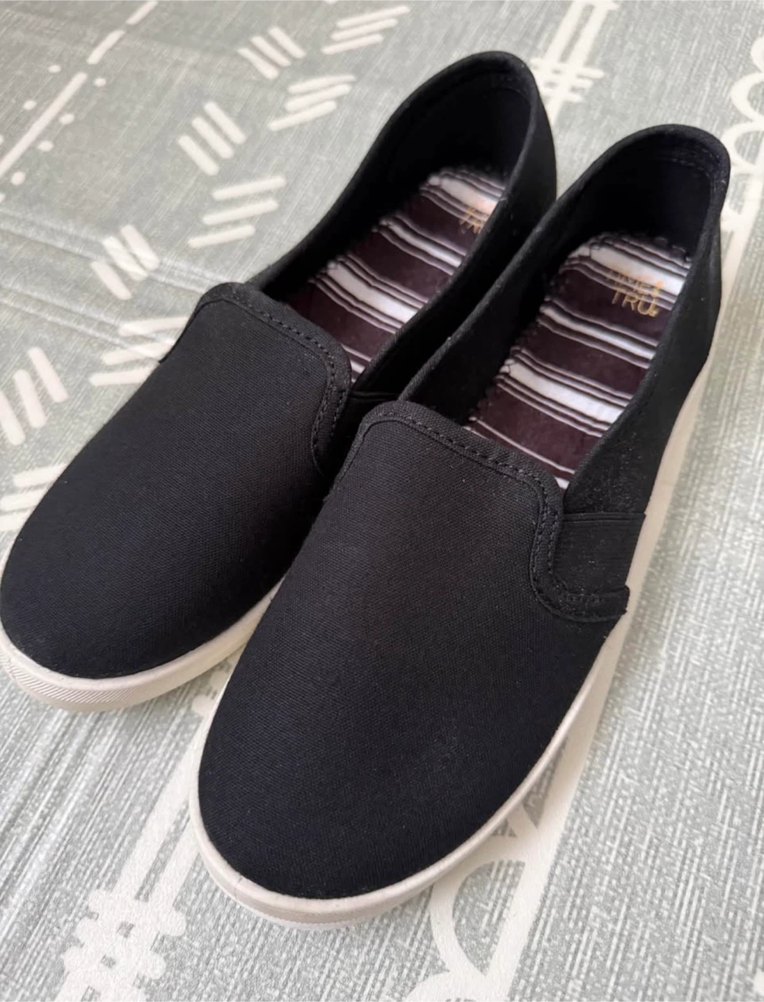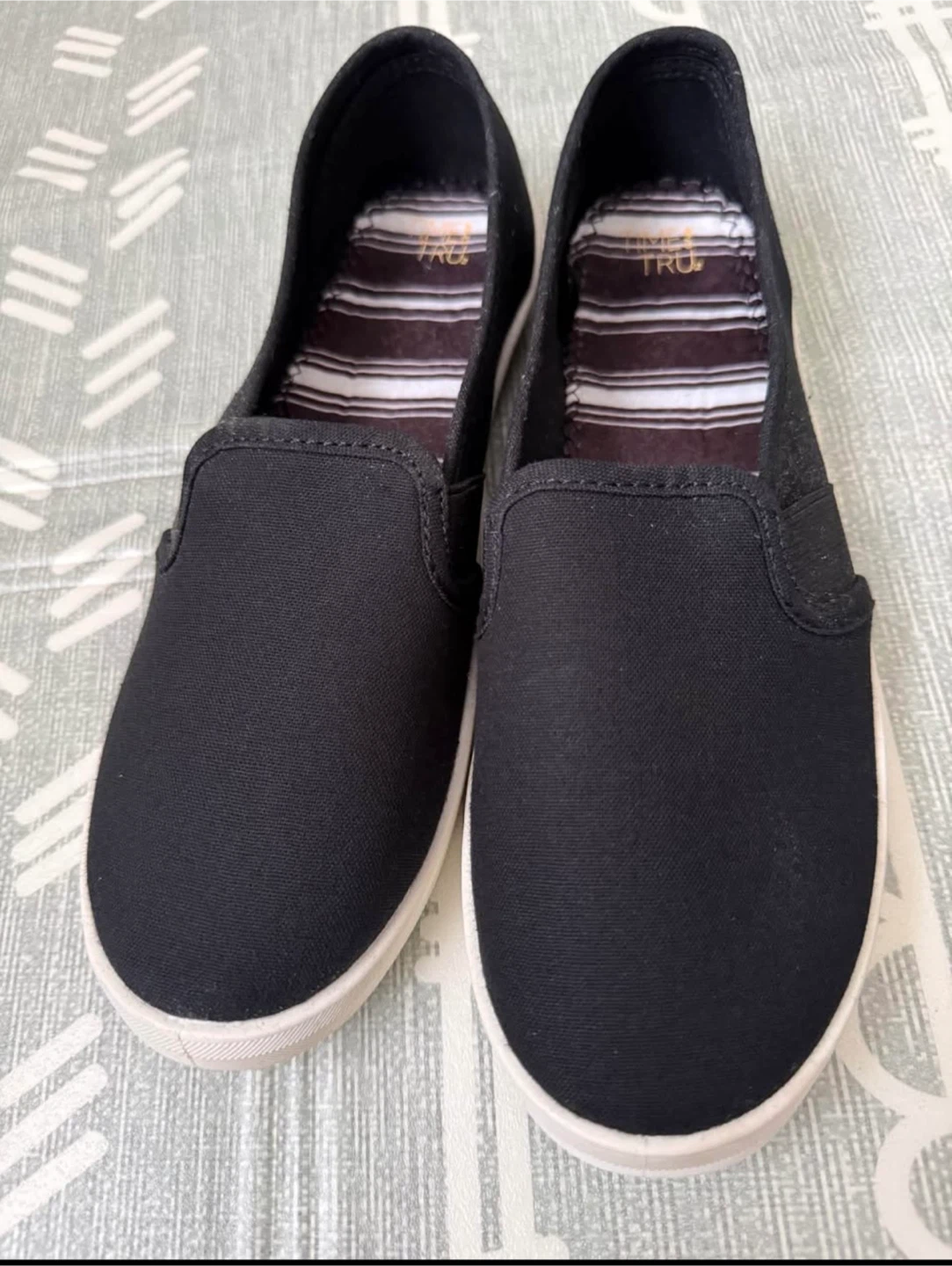Time and Tru slip-on canvas shoes in black. Women's size 7. These shoes have a comfortable striped lining and a durable sole. Great for everyday wear!