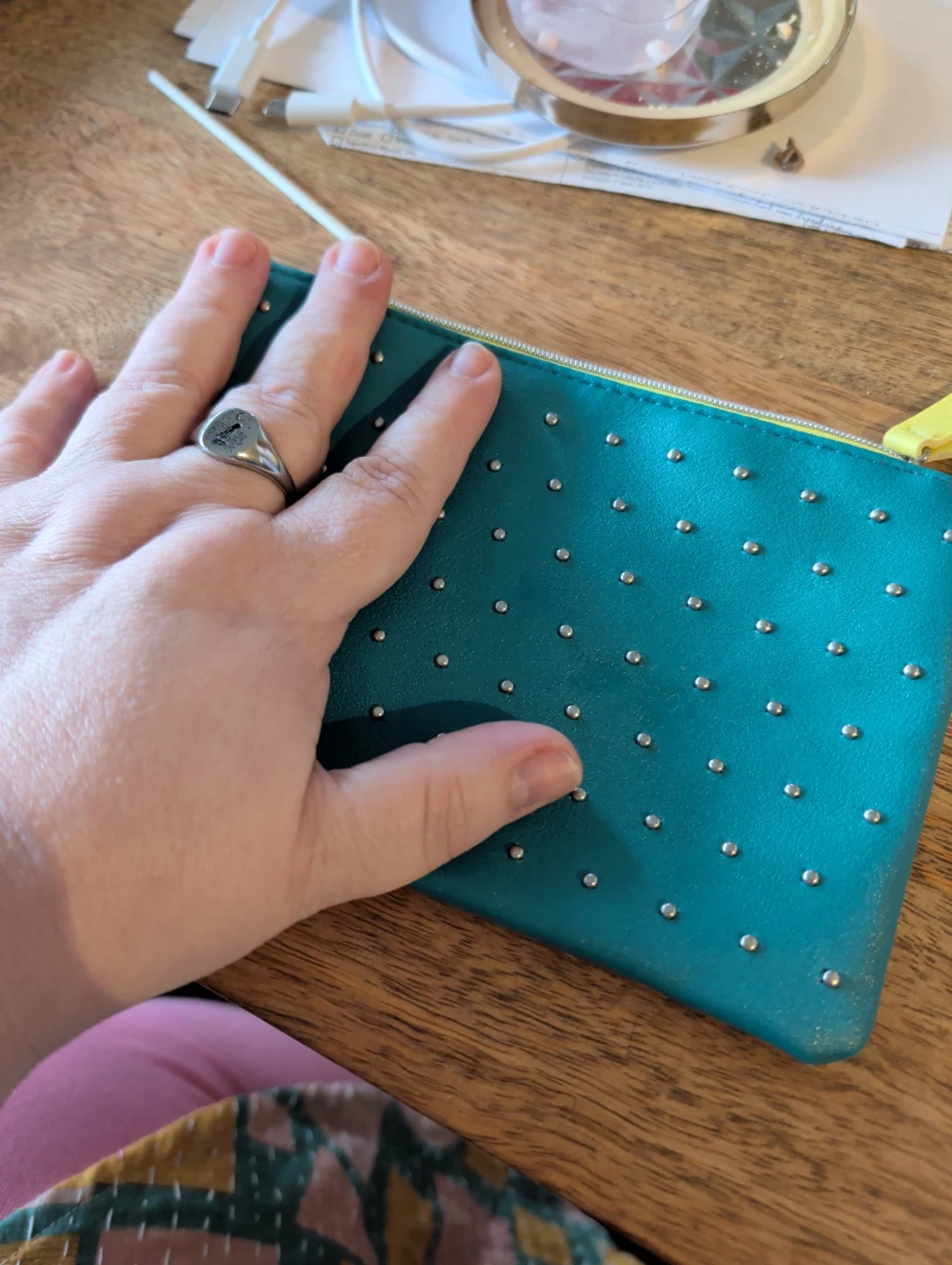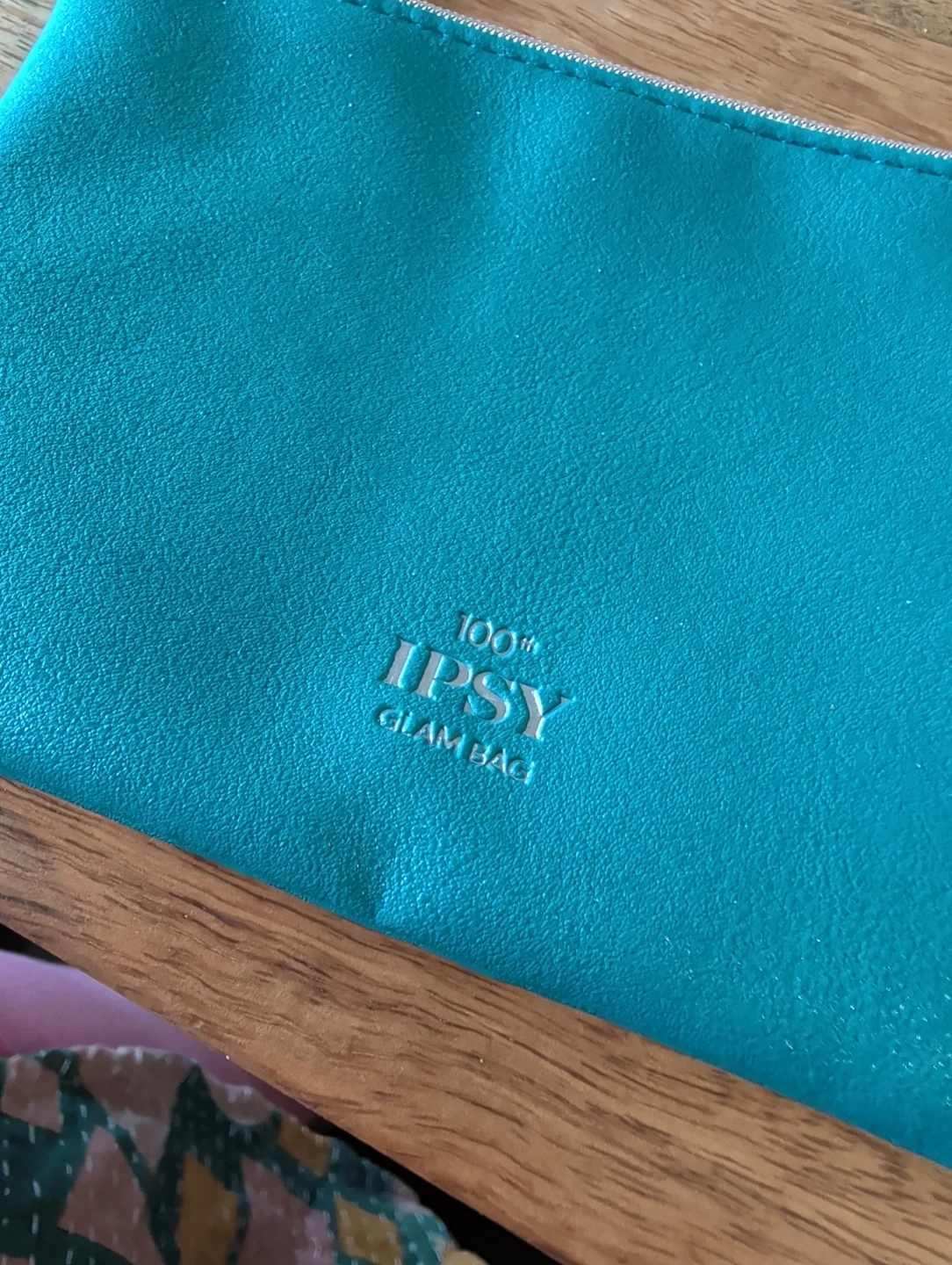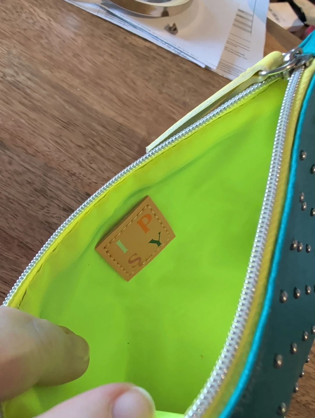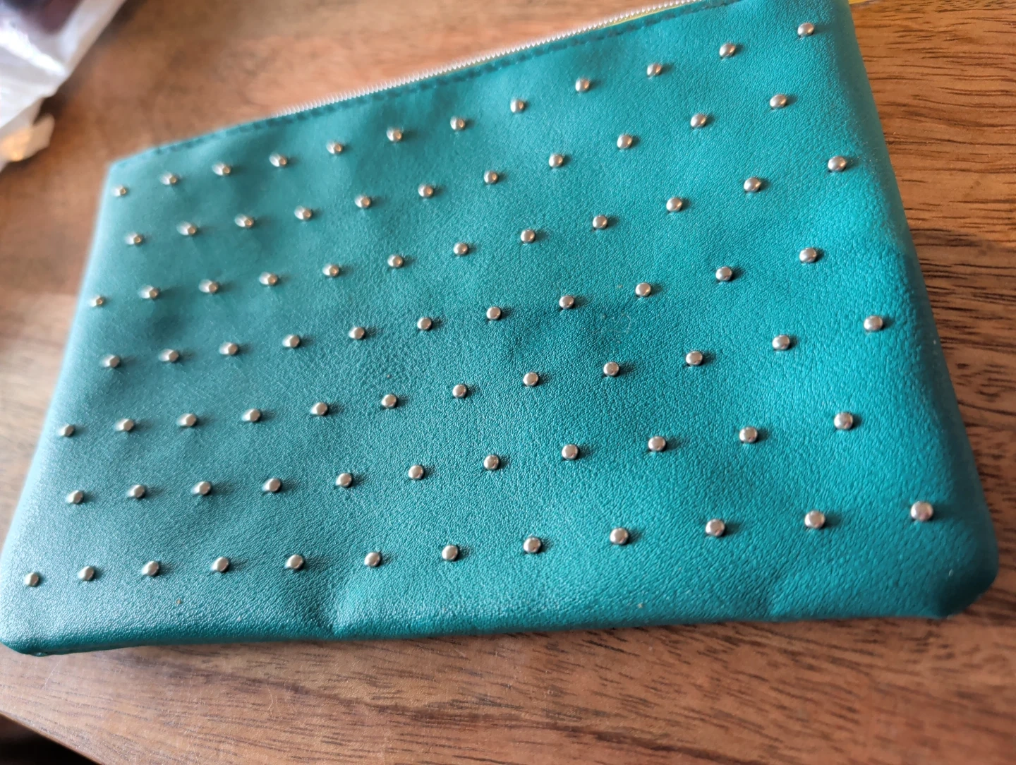Teal makeup bag with silver studs and a yellow zipper. It's from Ipsy and features a bright lime green interior lining. Measures approximately 8" x 5.5".