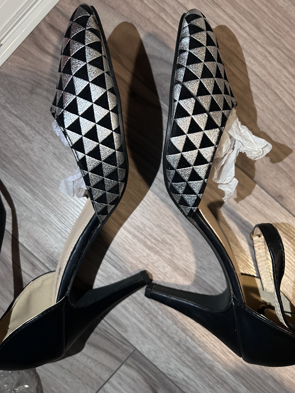 These are black and silver high heels with an ankle strap. They have a geometric pattern and are a size 41. Great for formal wear. Brand new and price is negotiable.