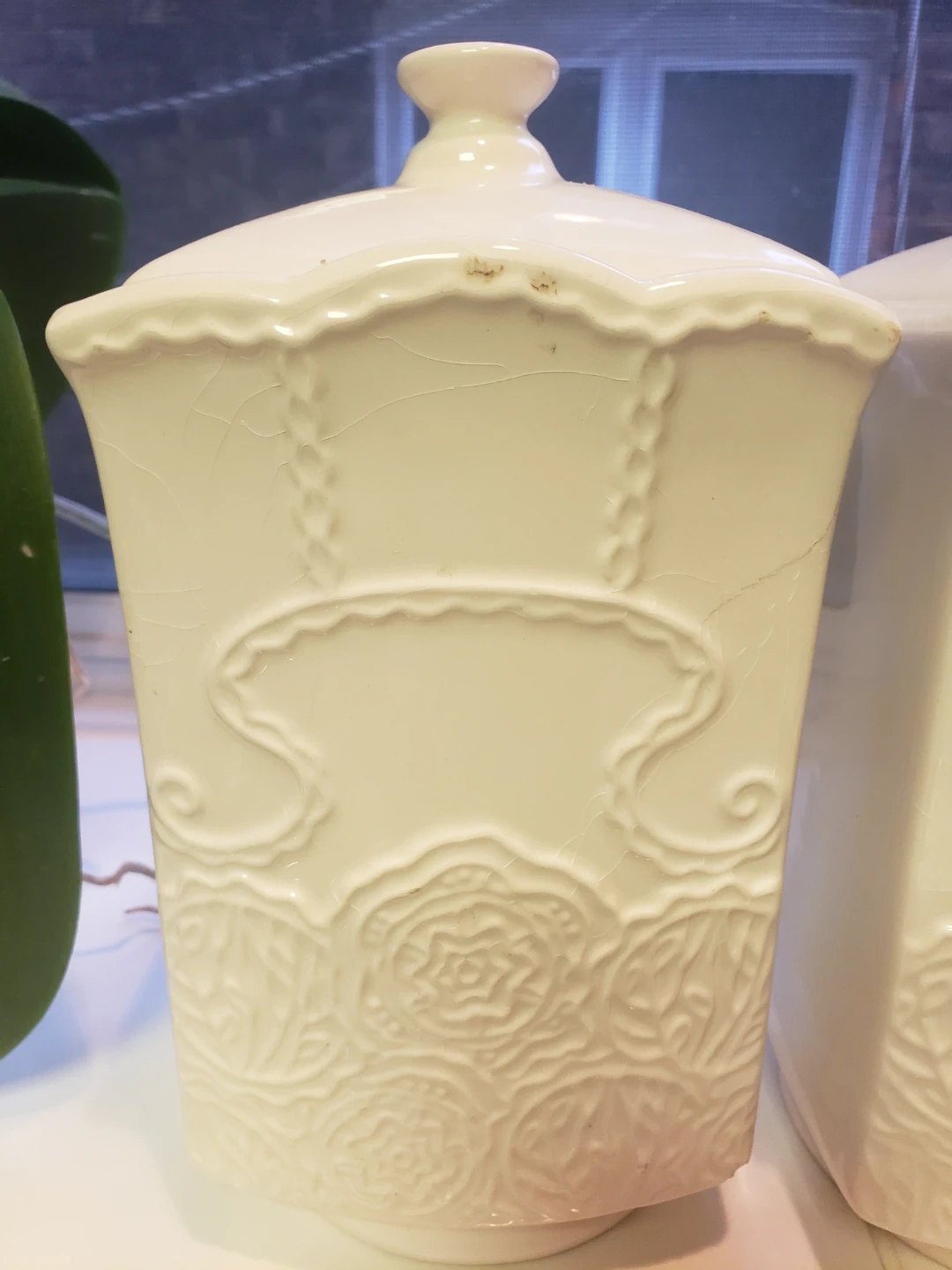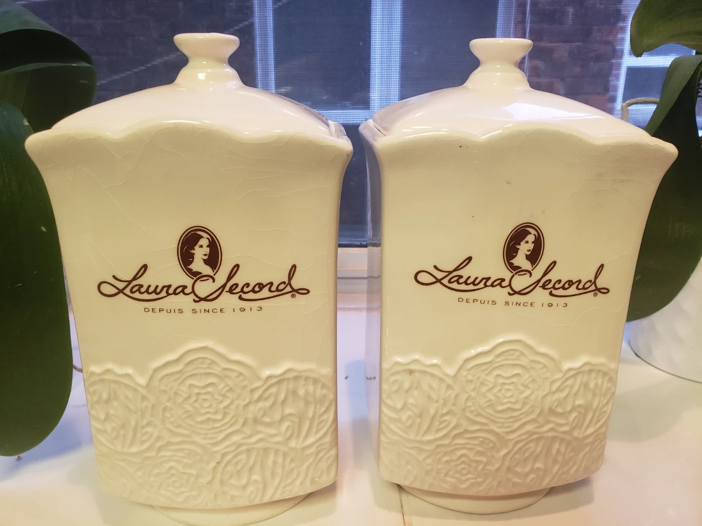 Two decorative canisters with lids from Laura Secord. Features a cream colour with embossed floral designs. Great for kitchen counter storage or display!