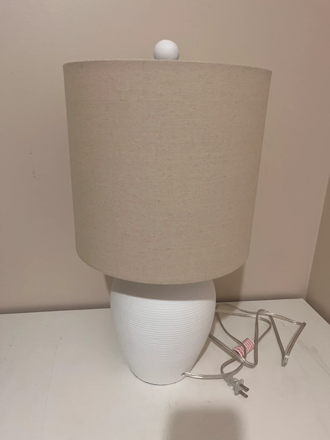 This is a white table lamp with a textured base. It comes with a neutral linen drum shade. Great for adding ambient lighting to any room!