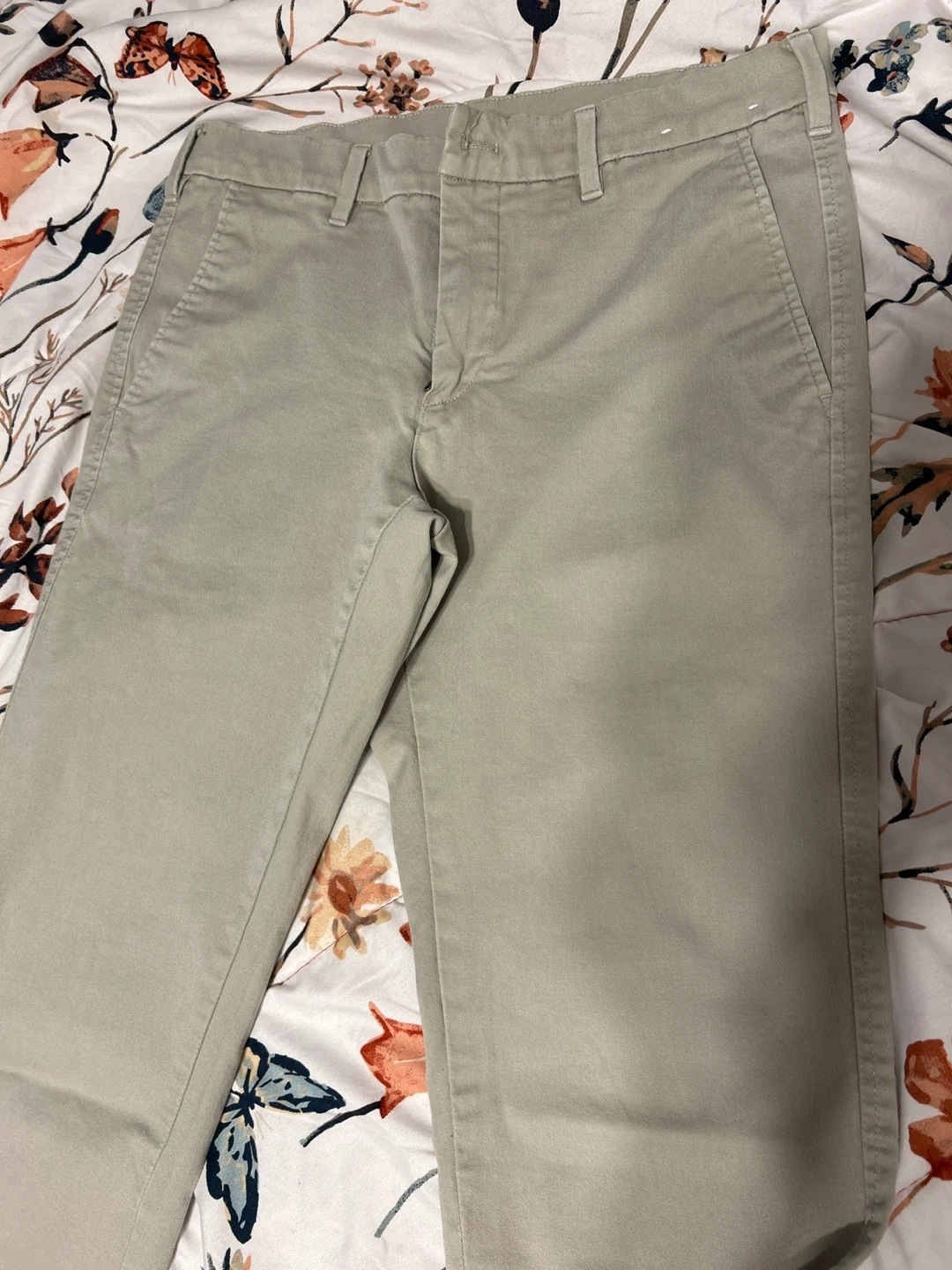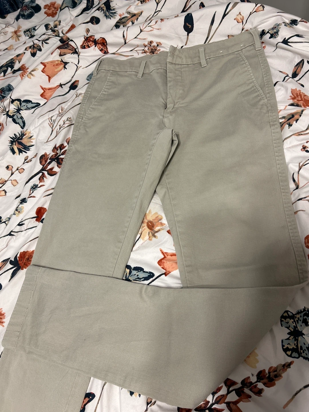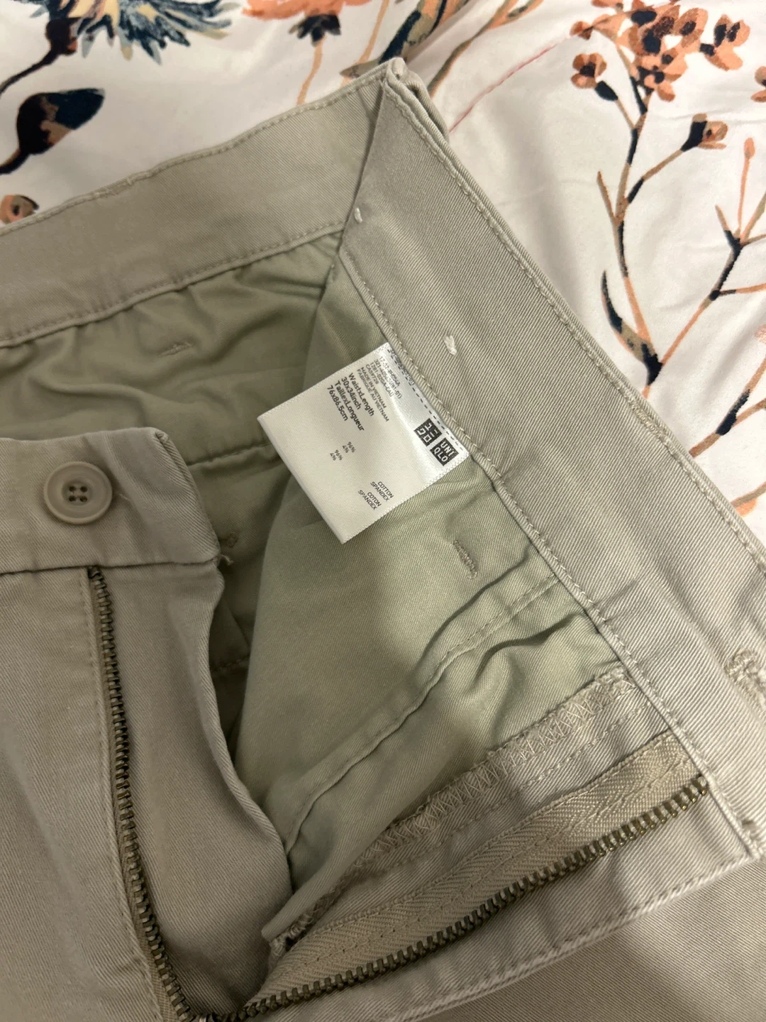 Classic khaki chinos from UNIQLO. These pants are made with durable fabric and feature a comfortable fit. They're great for everyday wear or dressing up. Button and zip fly closure. Worn once!