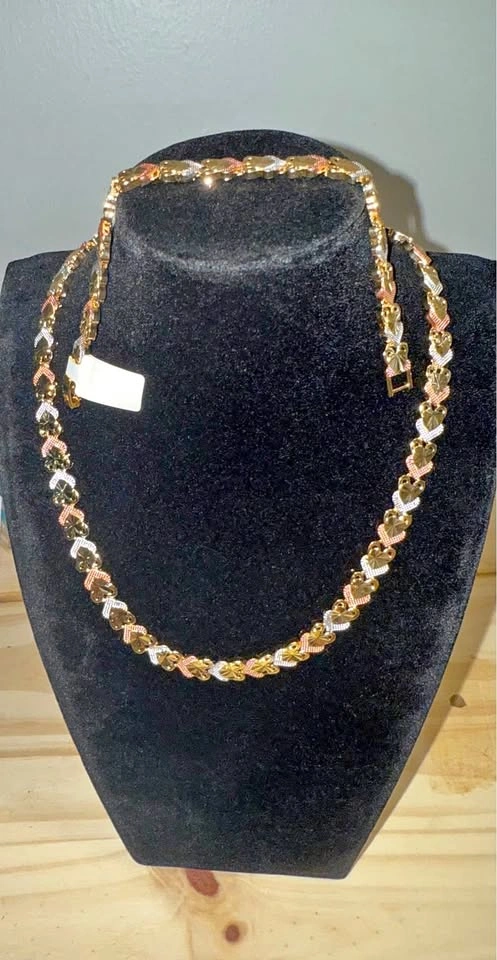 18 inches long tri colored heart necklace 18K Gold fill with a matching bracelet.