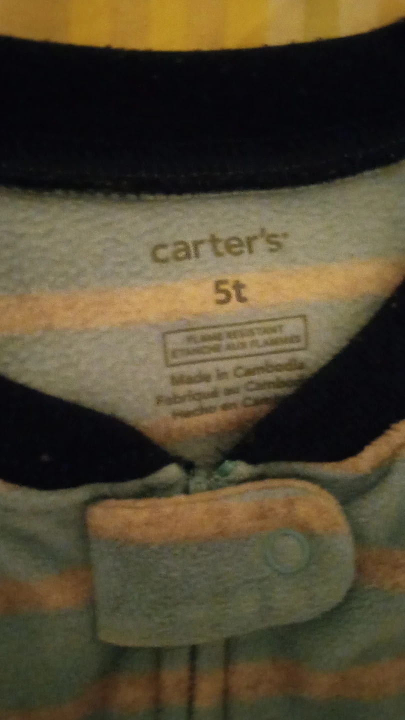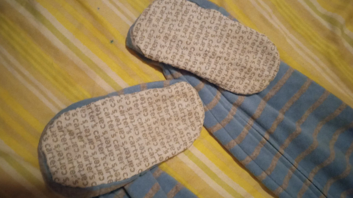 Blue striped footed pajamas with an excavator graphic. They're made of flame-resistant material and feature non-slip grips on the soles. Perfect for keeping little ones cozy and safe at bedtime!