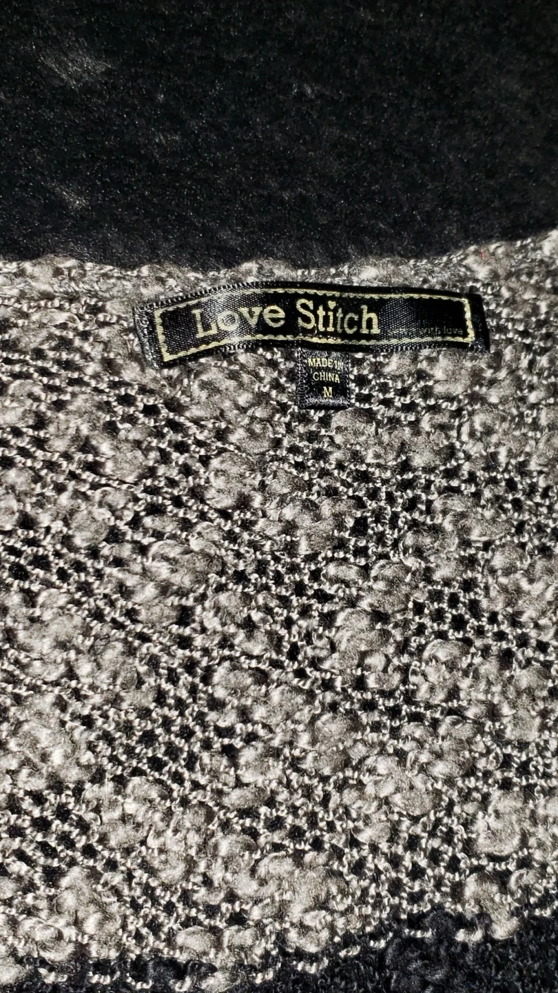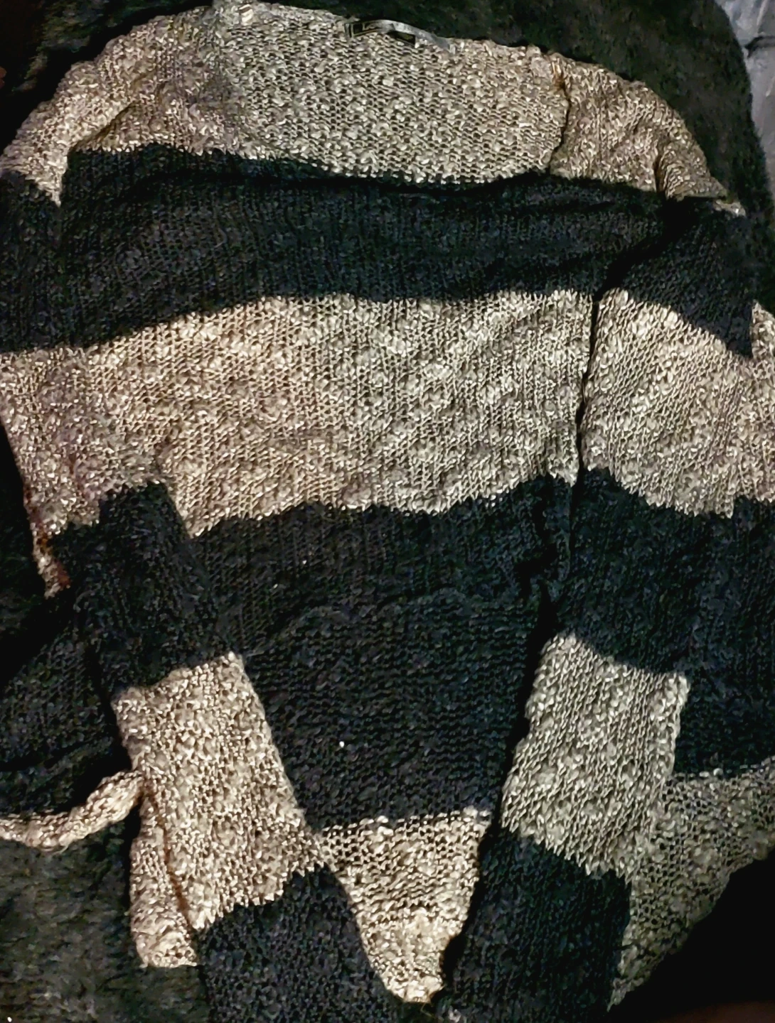 The sweater has a unique knit pattern in black and grey stripes.The back is longer than the front which is cropped. It is a size medium and very comfy!