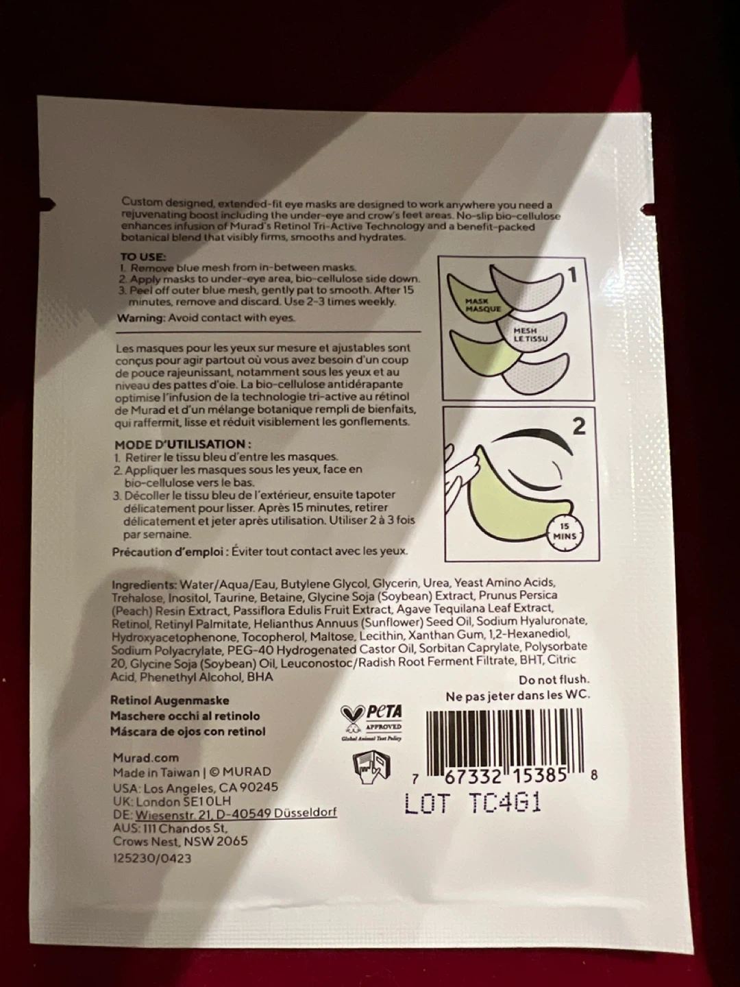 Murad Retinol Youth Renewal Eye Mask for treating under-eye and crow's feet. This bio-cellulose mask is designed for extended wear. Each mask contains 4ml of product.