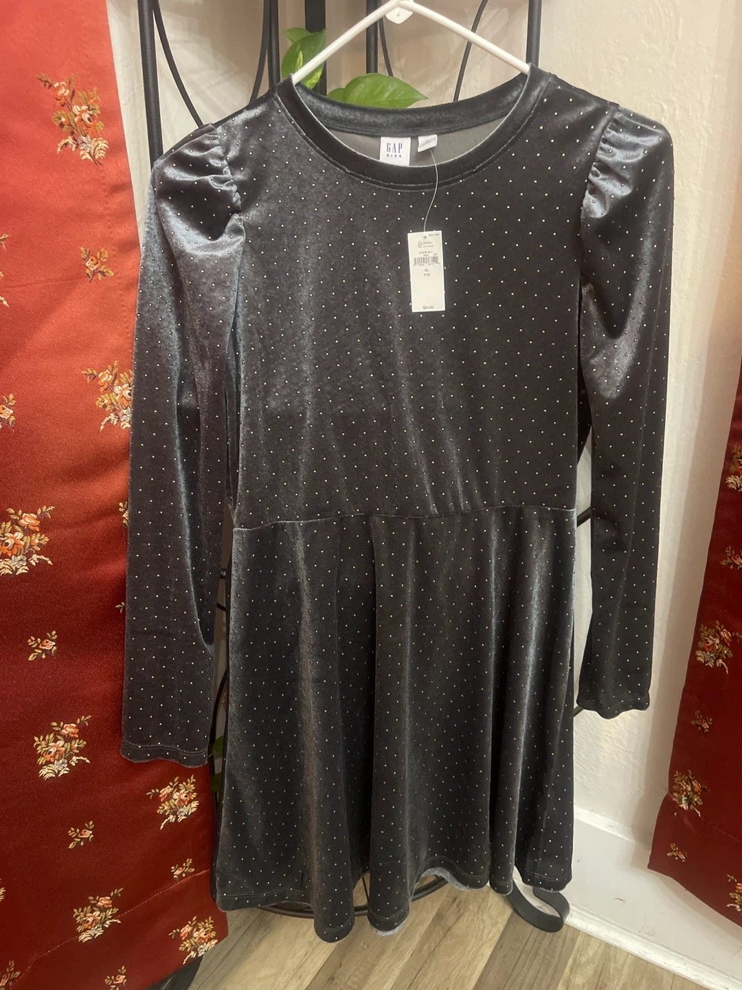 I'm selling a brand new Gap Kids dress! It's a black velvet dress with gold studs and long sleeves. It's a size XL (12) and originally retailed for $54.95.