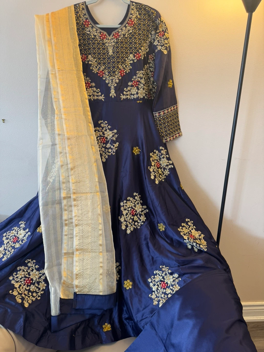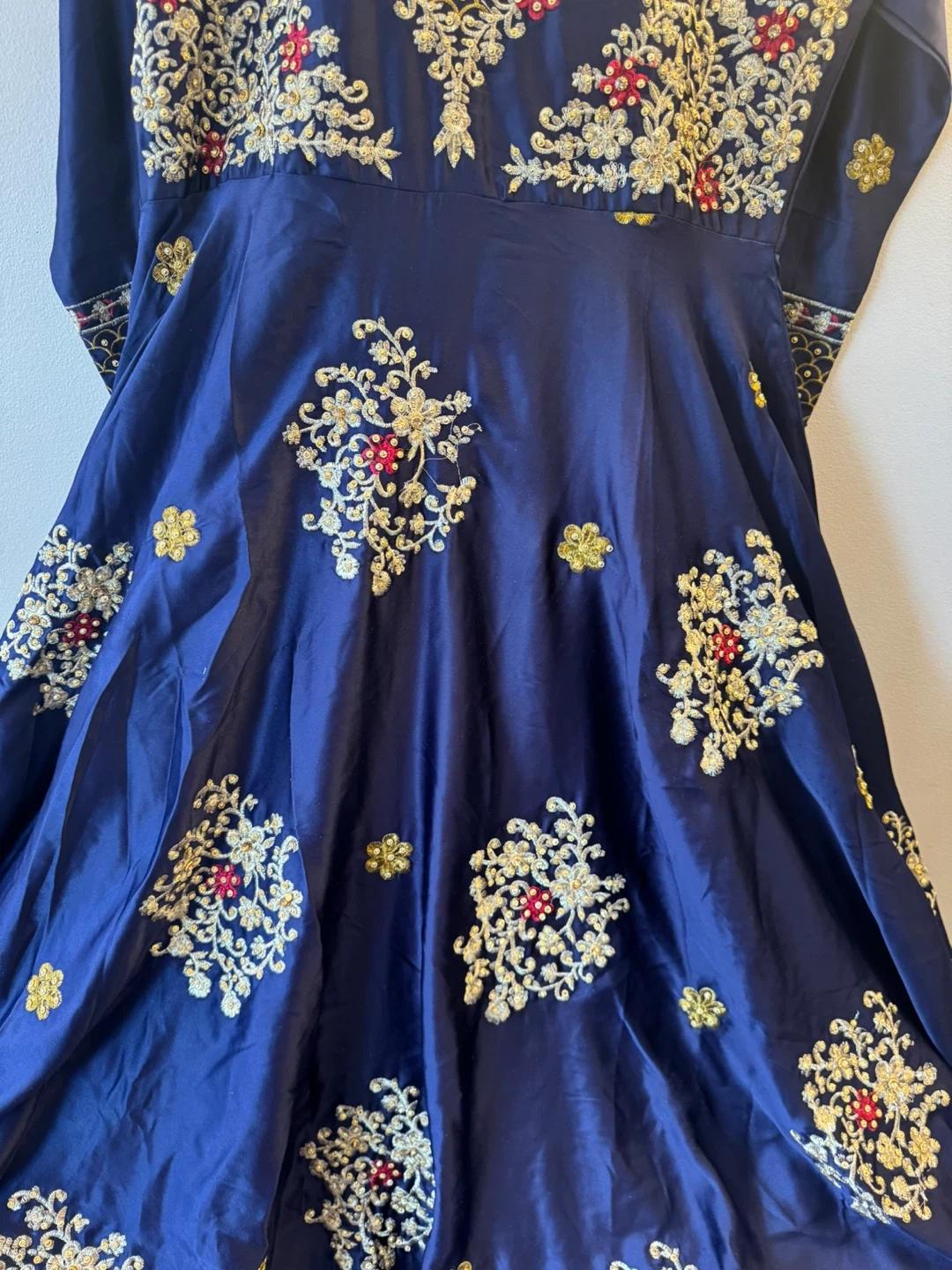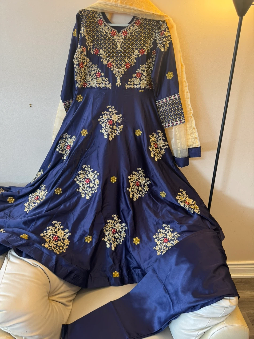 Beautiful blue maxi suit featuring intricate gold and red embroidery throughout. It includes a matching sheer dupatta. This outfit is perfect for festive occasions and celebrations.