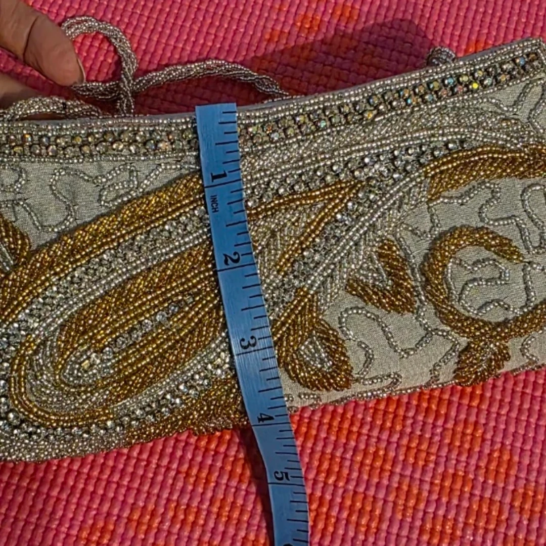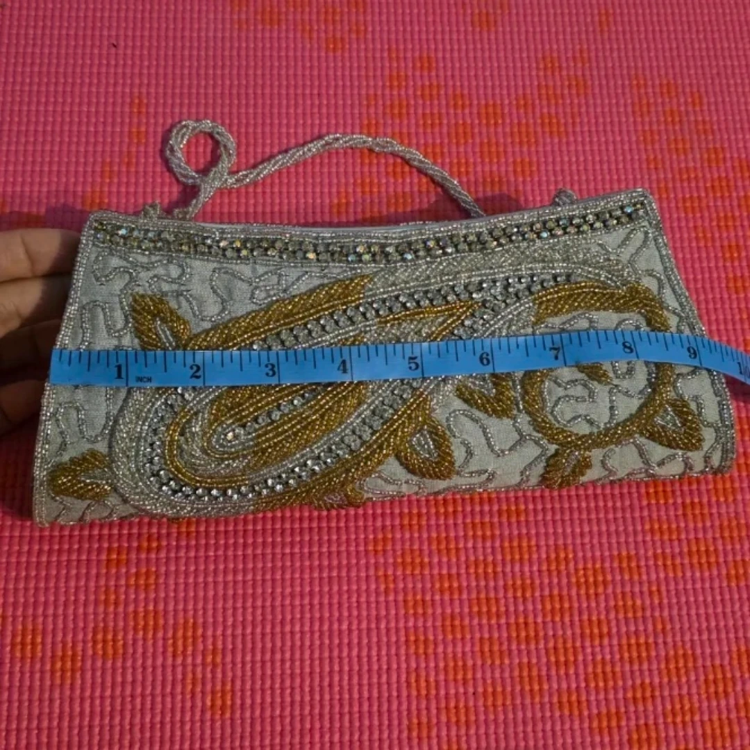 This beaded clutch purse is silver and gold with ornate detailing. Measurements in pictures. It's perfect for special occasions or an evening out! Also, it will go really well with south asian dresses.