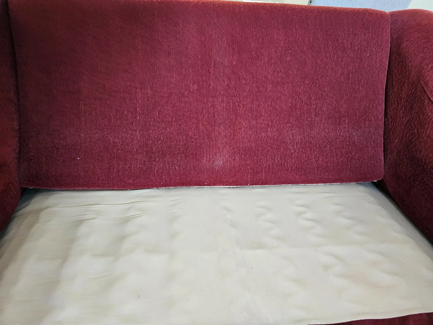 A comfortable red loveseat sofa. It has a textured fabric upholstery and plush cushions. This sofa is a good size for smaller living spaces or apartments.