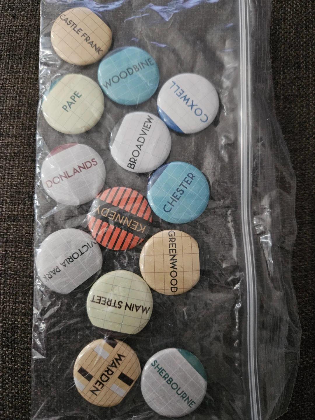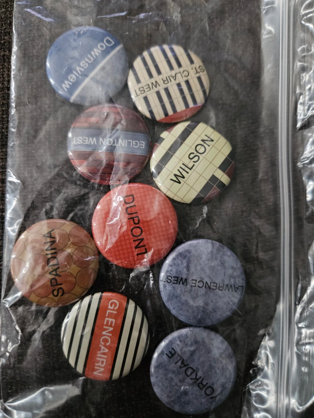 This set includes 62 one-inch buttons/pins containing stations in the system, but does not include the newer Downsview extension and Finch Line stations.
