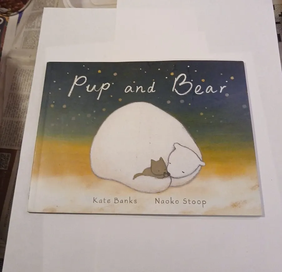 This is the children's book "Pup and Bear" by Kate Banks, illustrated by Naoko Stoop. It tells a heartwarming story about the polar bear and the pup. A sweet read for young children!
