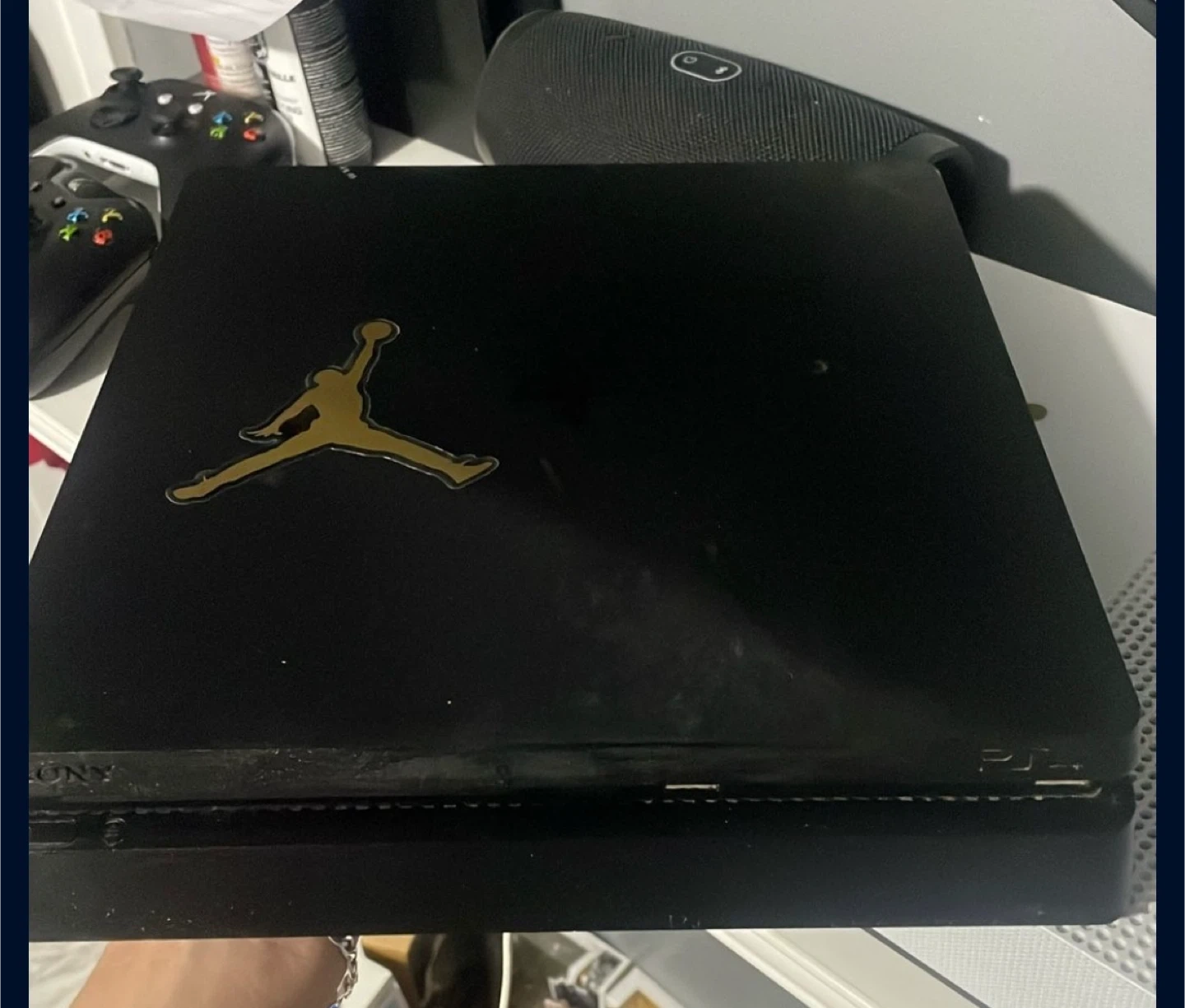 This is a black Sony PlayStation 4 Slim console. It features the iconic Jordan logo on top. Ports include HDMI, USB, and Ethernet. Power cord and controllers are included.