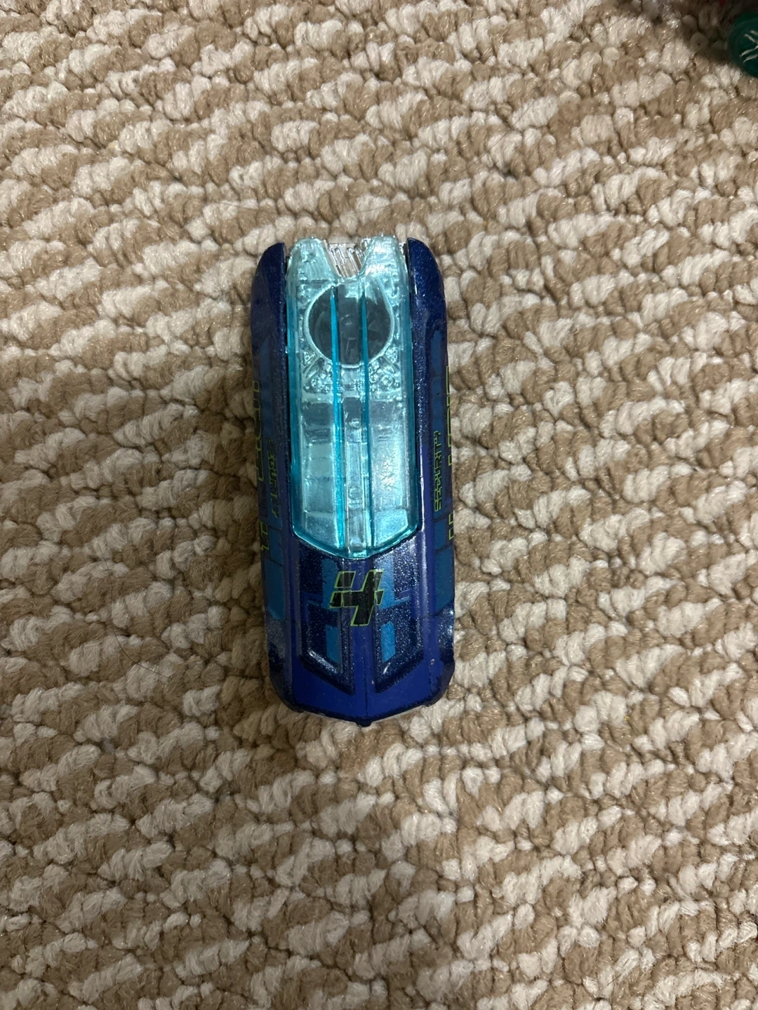 Here's a blue Hot Wheels car! It has a cool design with transparent blue accents and the number 4 on the front. Perfect for collectors or kids who love playing with toy cars free