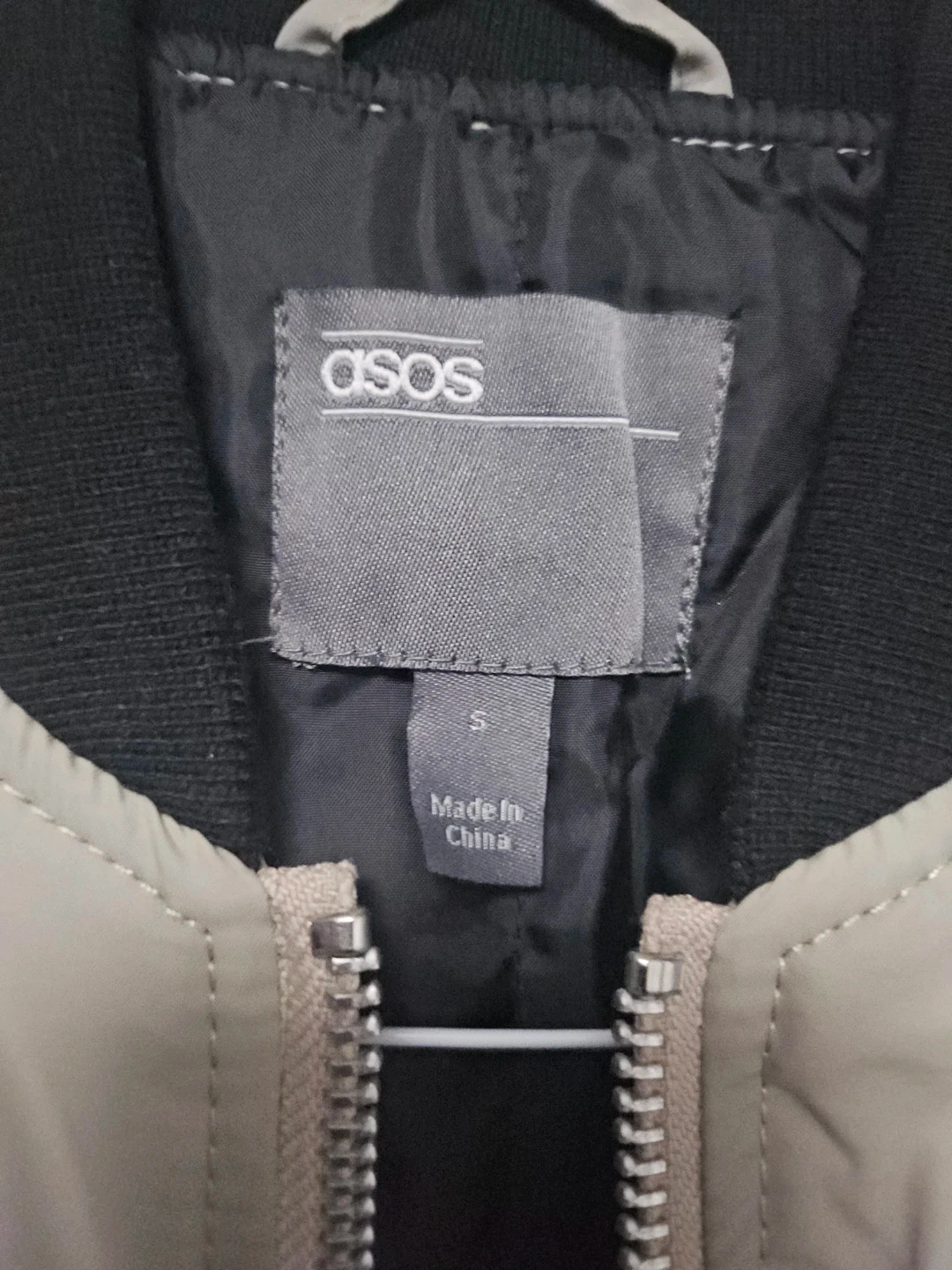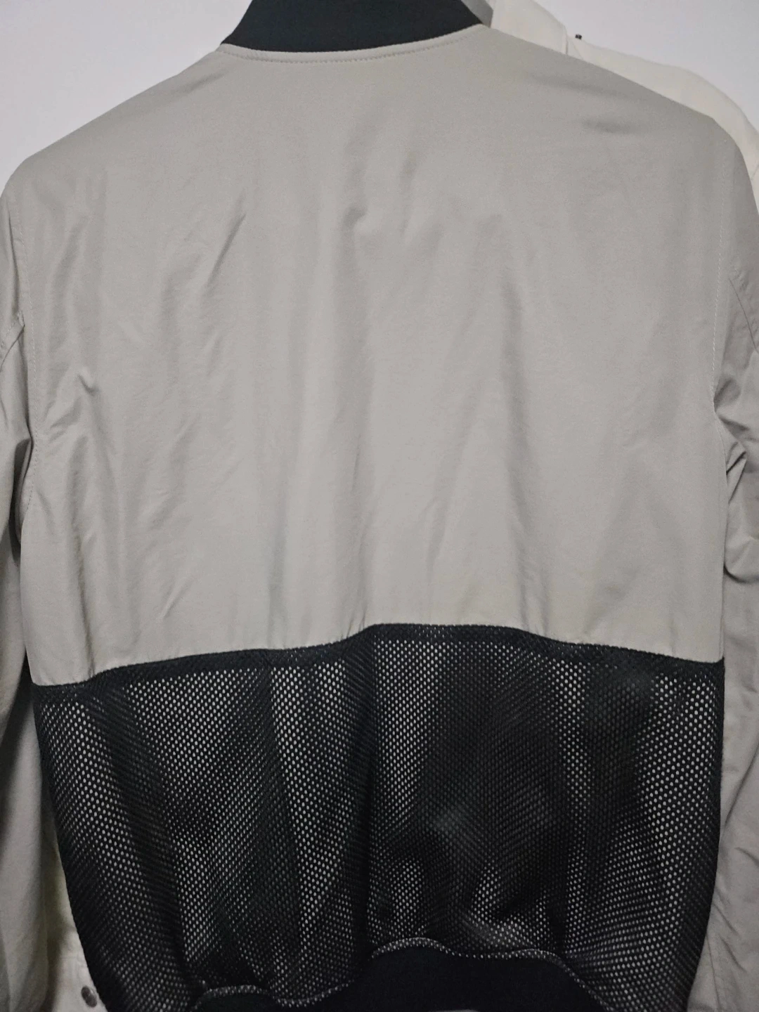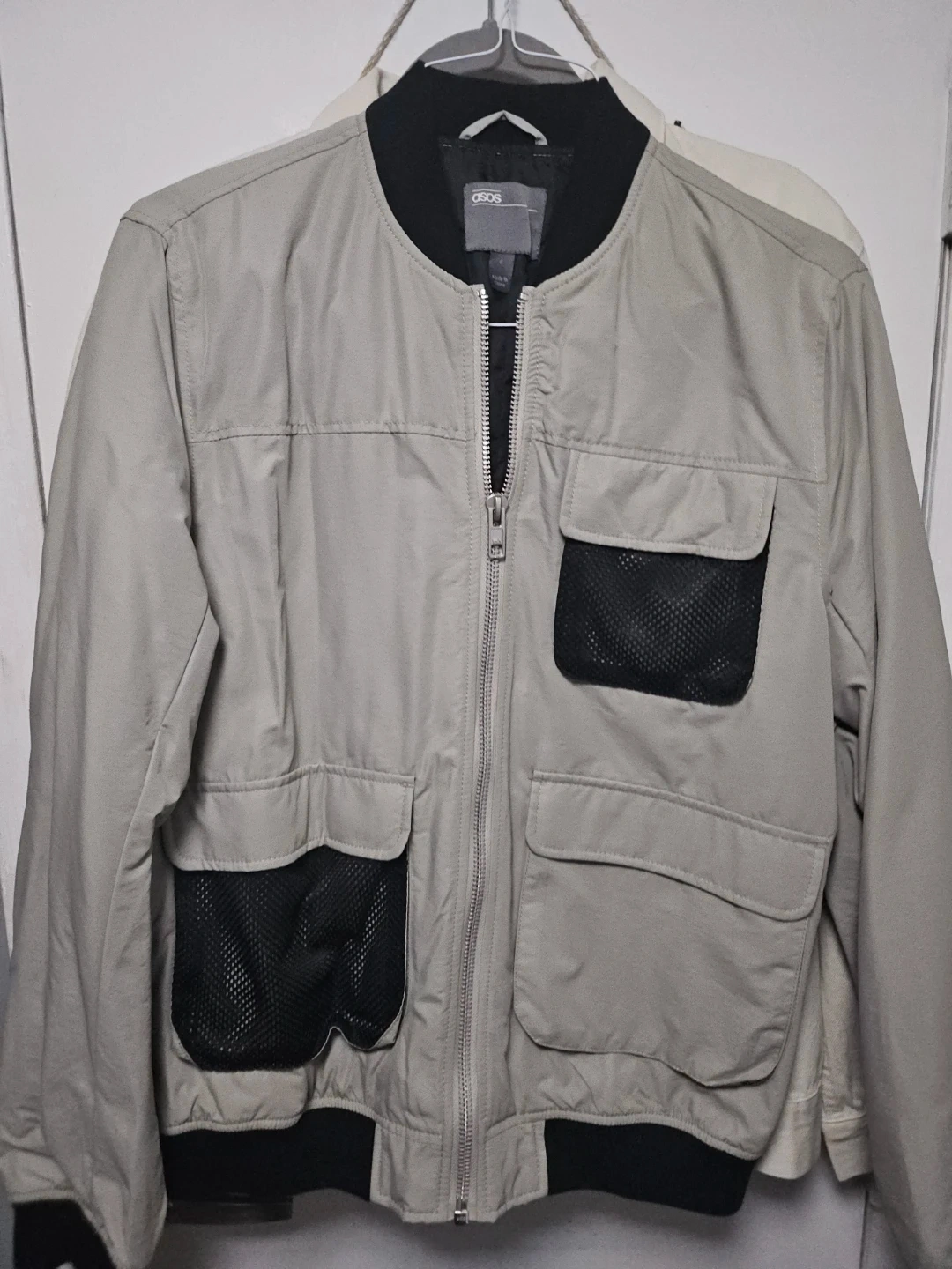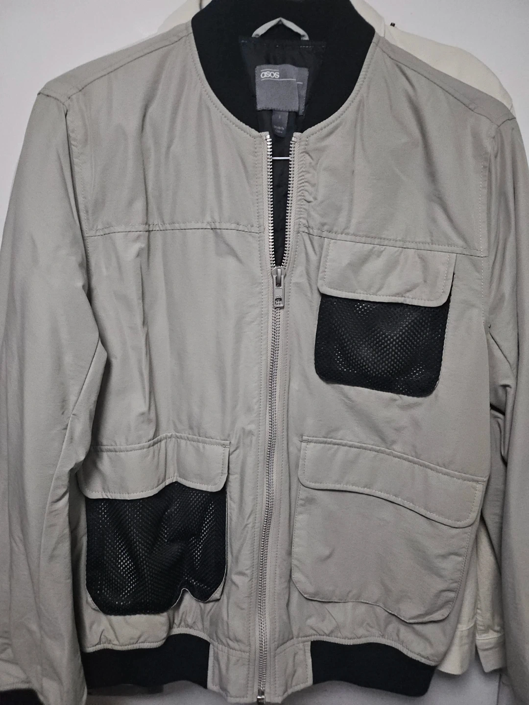 Lightweight ASOS bomber jacket in a neutral gray color. Features multiple pockets with black mesh accents on the front and a mesh panel on the lower back. Zipper closure. Size S.