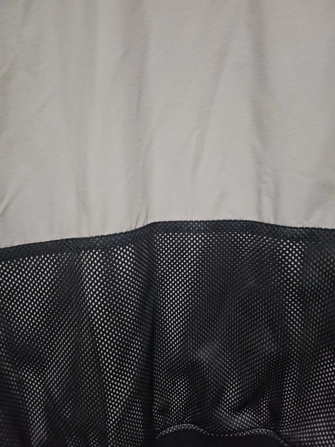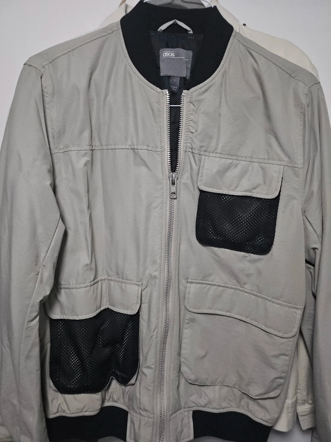 Lightweight ASOS bomber jacket in a neutral gray color. Features multiple pockets with black mesh accents on the front and a mesh panel on the lower back. Zipper closure. Size S.