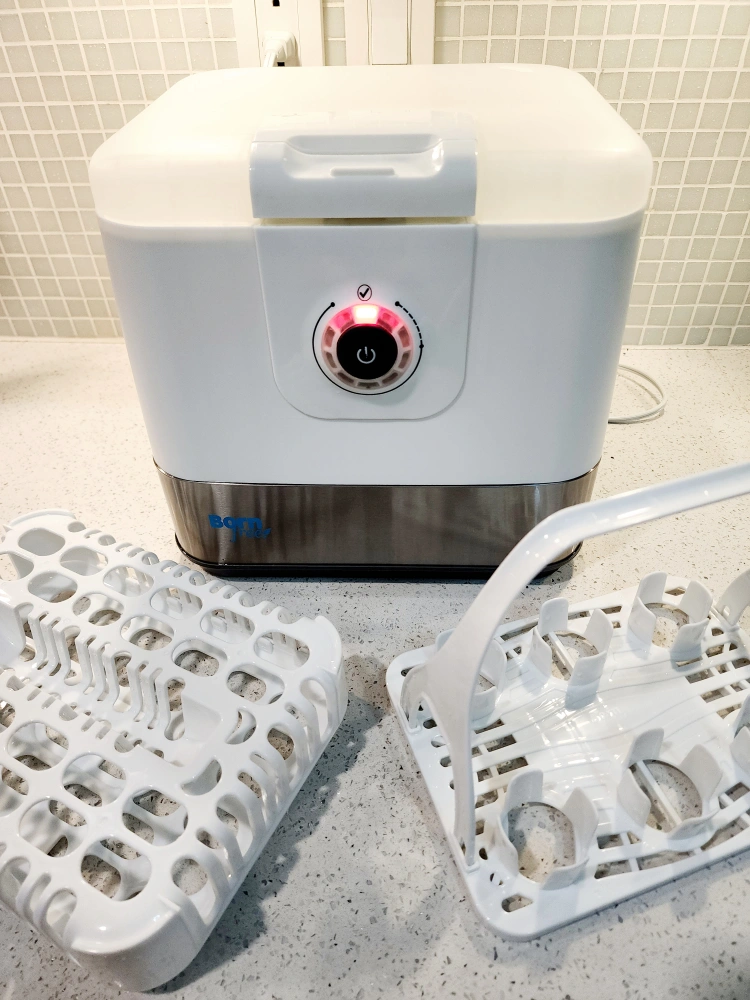 The Born Free Tru Clean Steam Sterilizing System steam kills 99.9%* of household bacteria. This all in 1 system includes sterilizer, dishwasher basket, and drying rack. The one touch control with lights indicates where you are in the 16 minute sterilization or 4 minute cool down process for added convenience. Convenient one handed lid release Hinged lid with steam vent safely releases steam