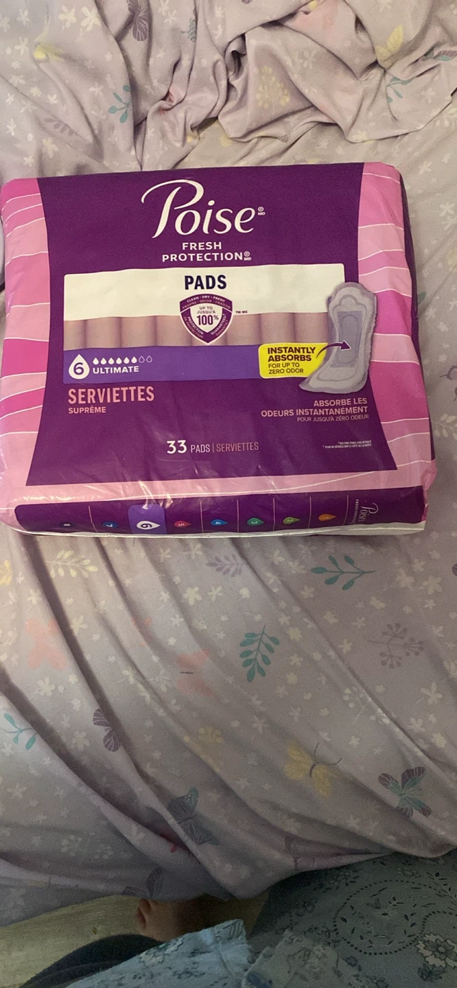 Poise Fresh Protection Ultimate Supreme pads come in a pack of 33. They instantly absorb for up to zero odor. These pads are designed for maximum absorbency.