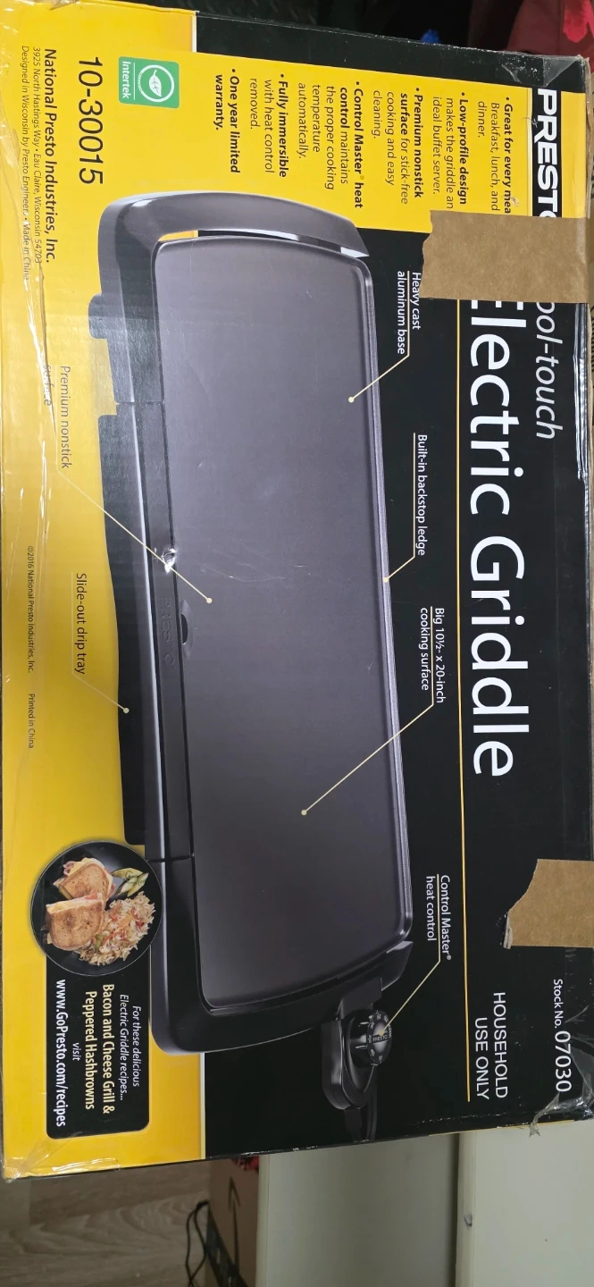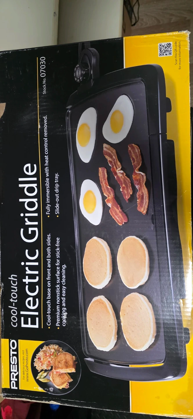 I'm selling a Presto Cool-Touch Electric Griddle. It's perfect for breakfast, lunch, and dinner! It has a premium nonstick surface for easy cleaning and cooking. The griddle is fully immersible with heat control removed. It also has a slide-out drip tray. The box is included