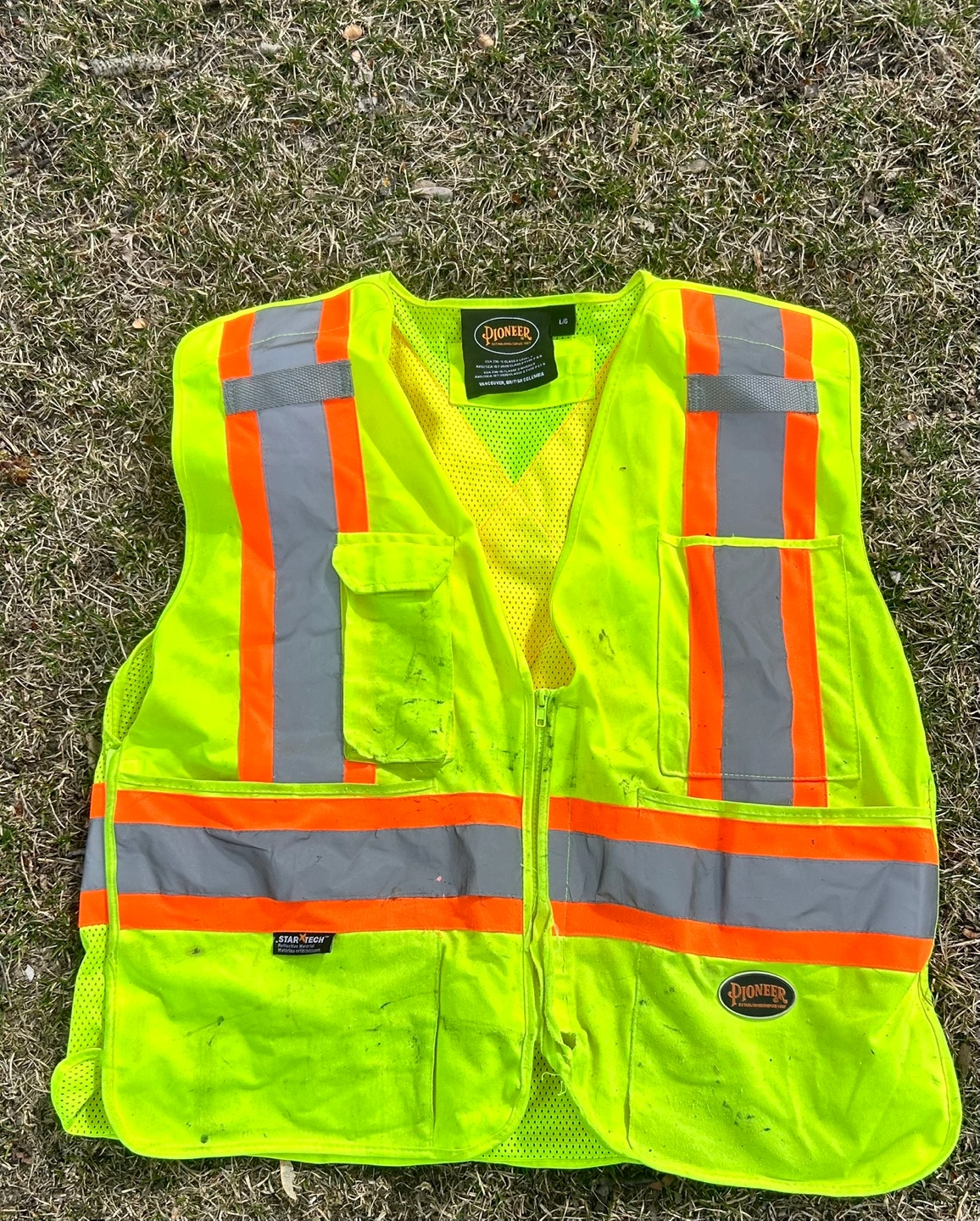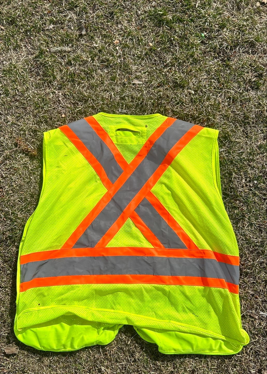 High-visibility safety vest. Lime green with reflective orange and silver stripes. Two front pockets. Zipper closure. Size large. Shows some minor wear.