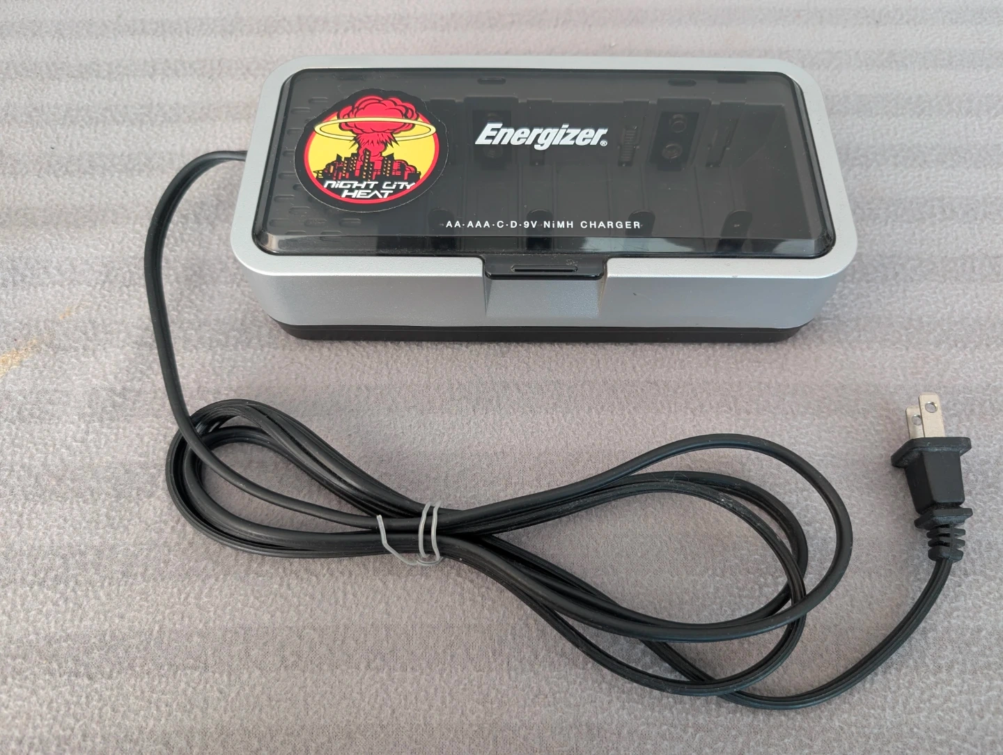 Energizer battery charger for AA, AAA, C, D, and 9V NiMH batteries. This charger comes with a power cord.