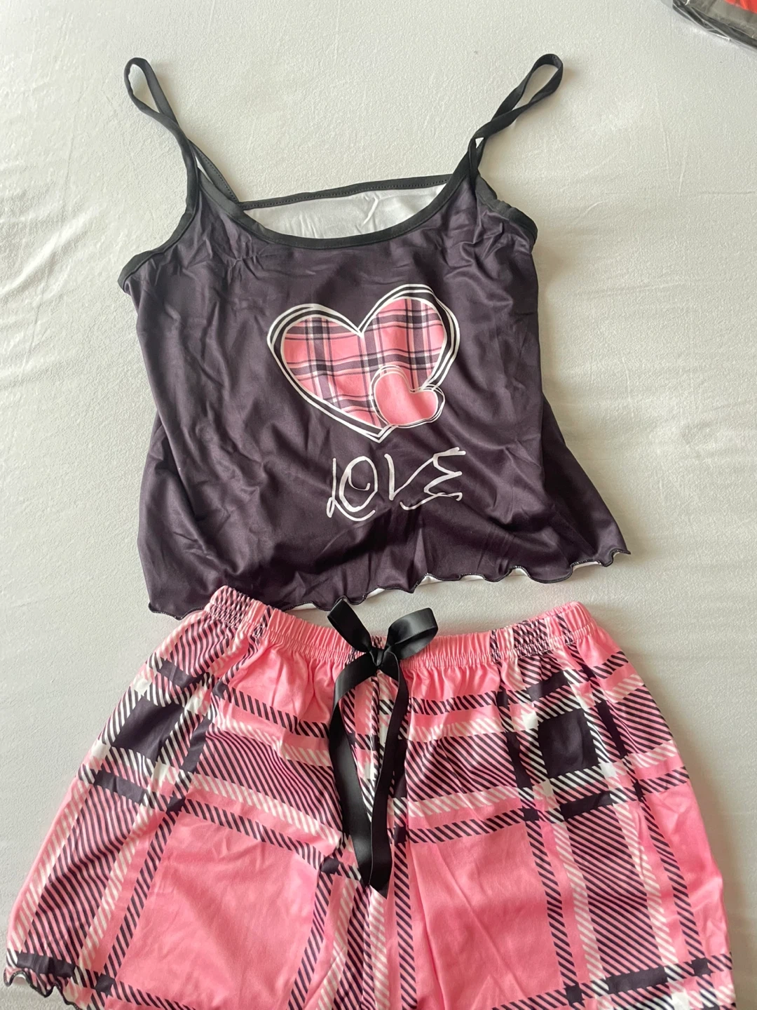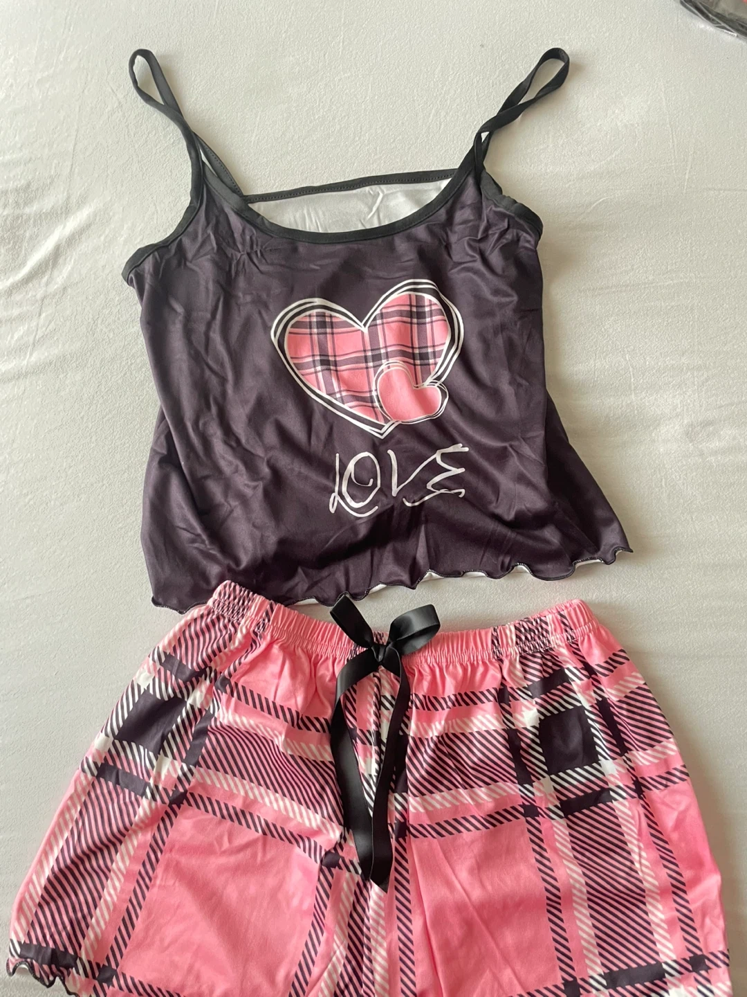 A cute and cozy pajama set featuring a camisole top with a heart and 'LOVE' graphic, and matching plaid shorts. Made from a silky material.