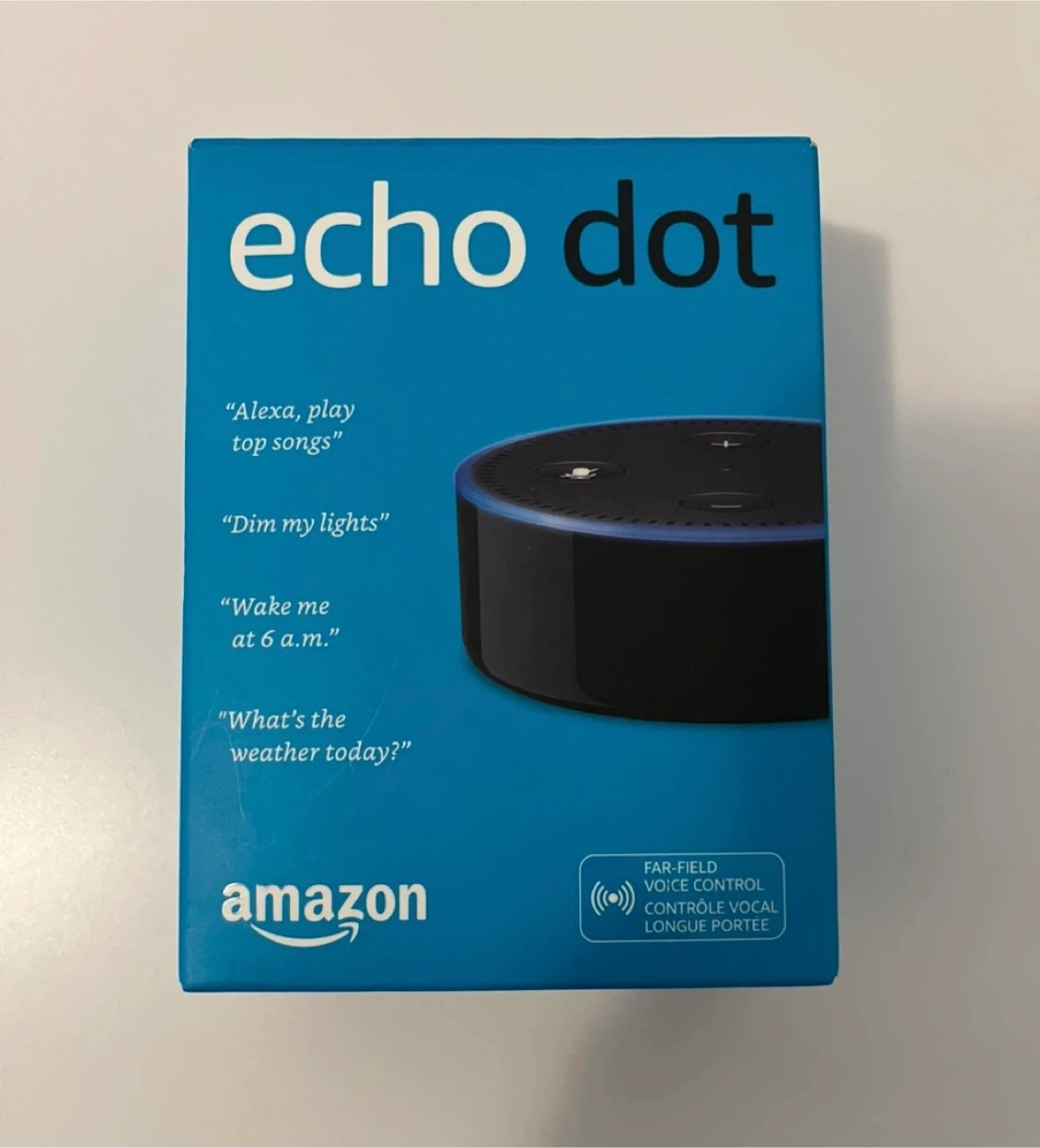 This is an Amazon Echo Dot smart speaker in its original packaging. It features far-field voice control, allowing you to interact with Alexa. It's useful for controlling smart home devices and getting information quickly.