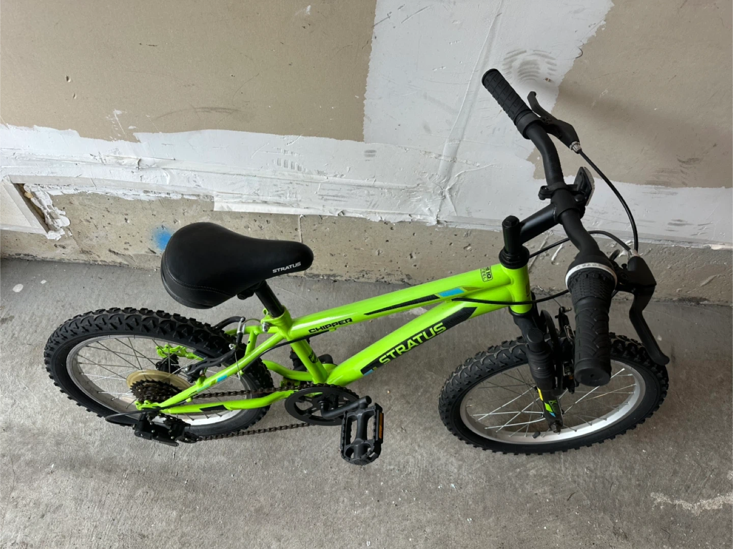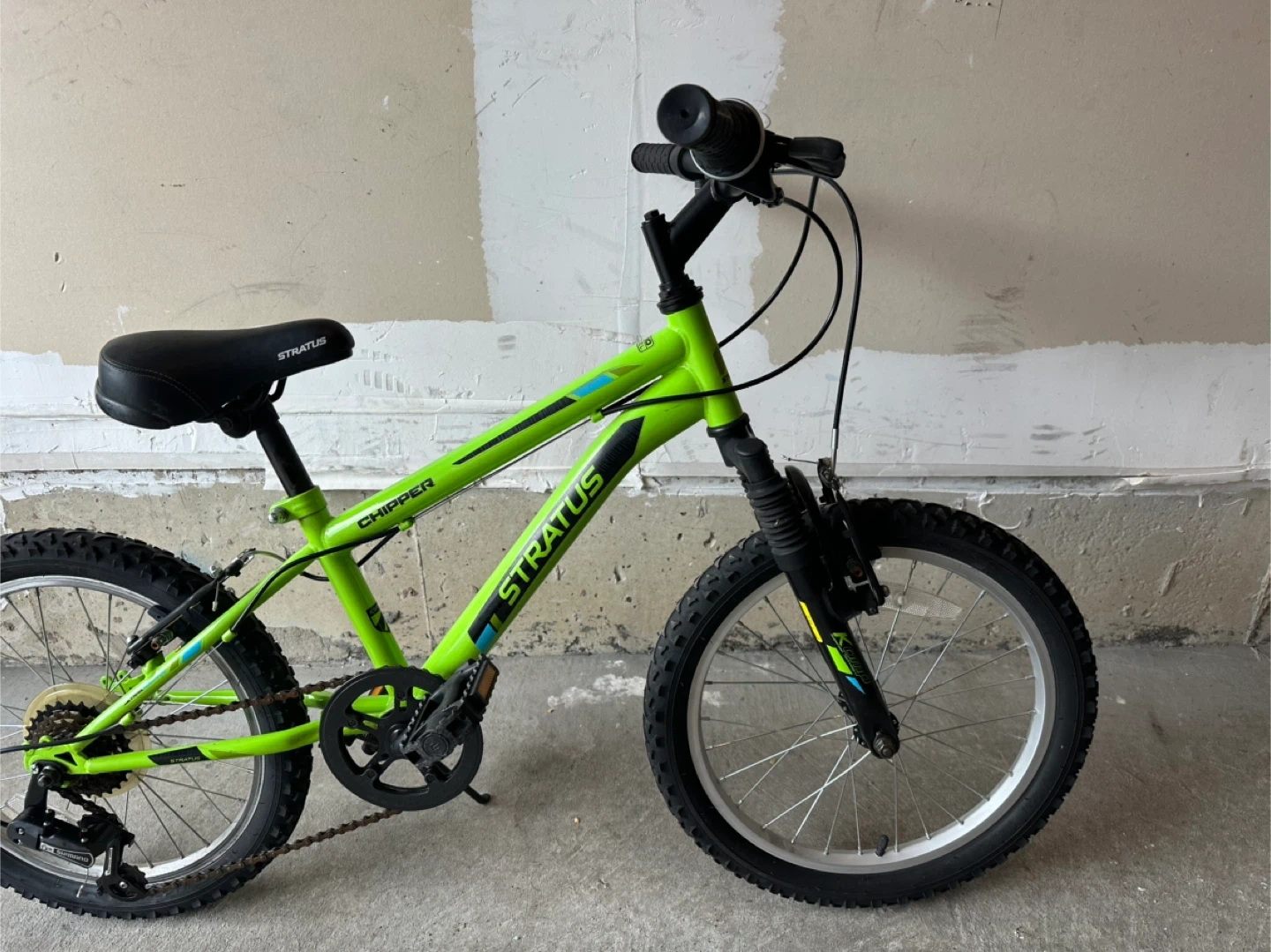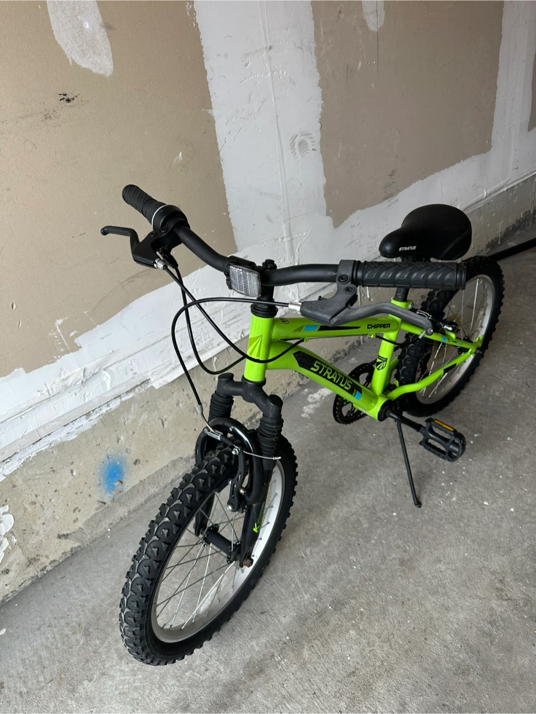 This is a green Stratus Chipper kids bicycle with 18-inch wheels. It has a sturdy frame and front suspension. Comes with hand brakes and a kickstand.