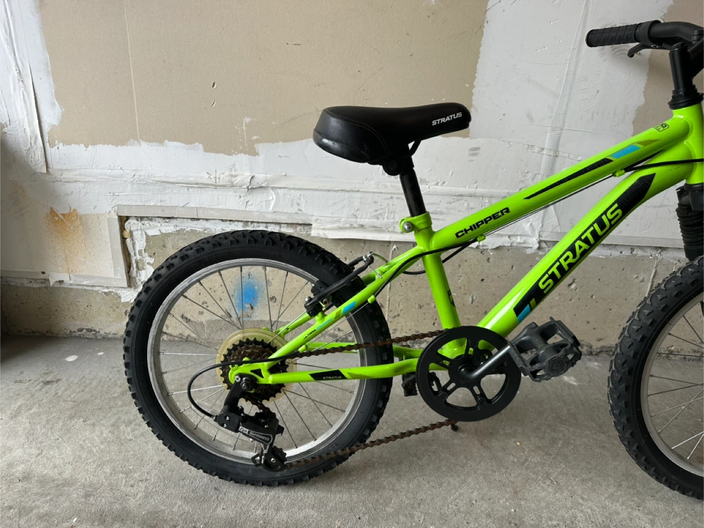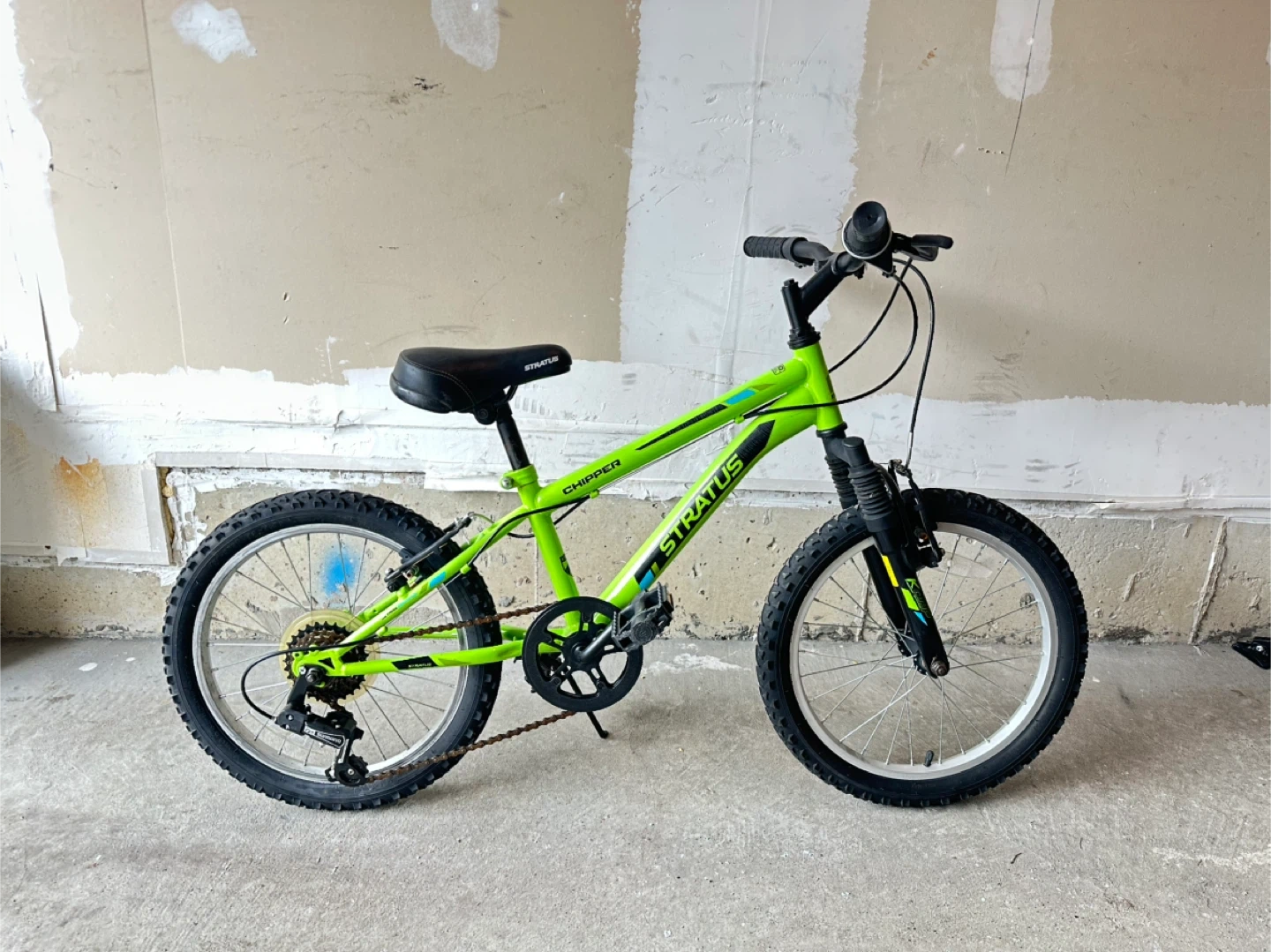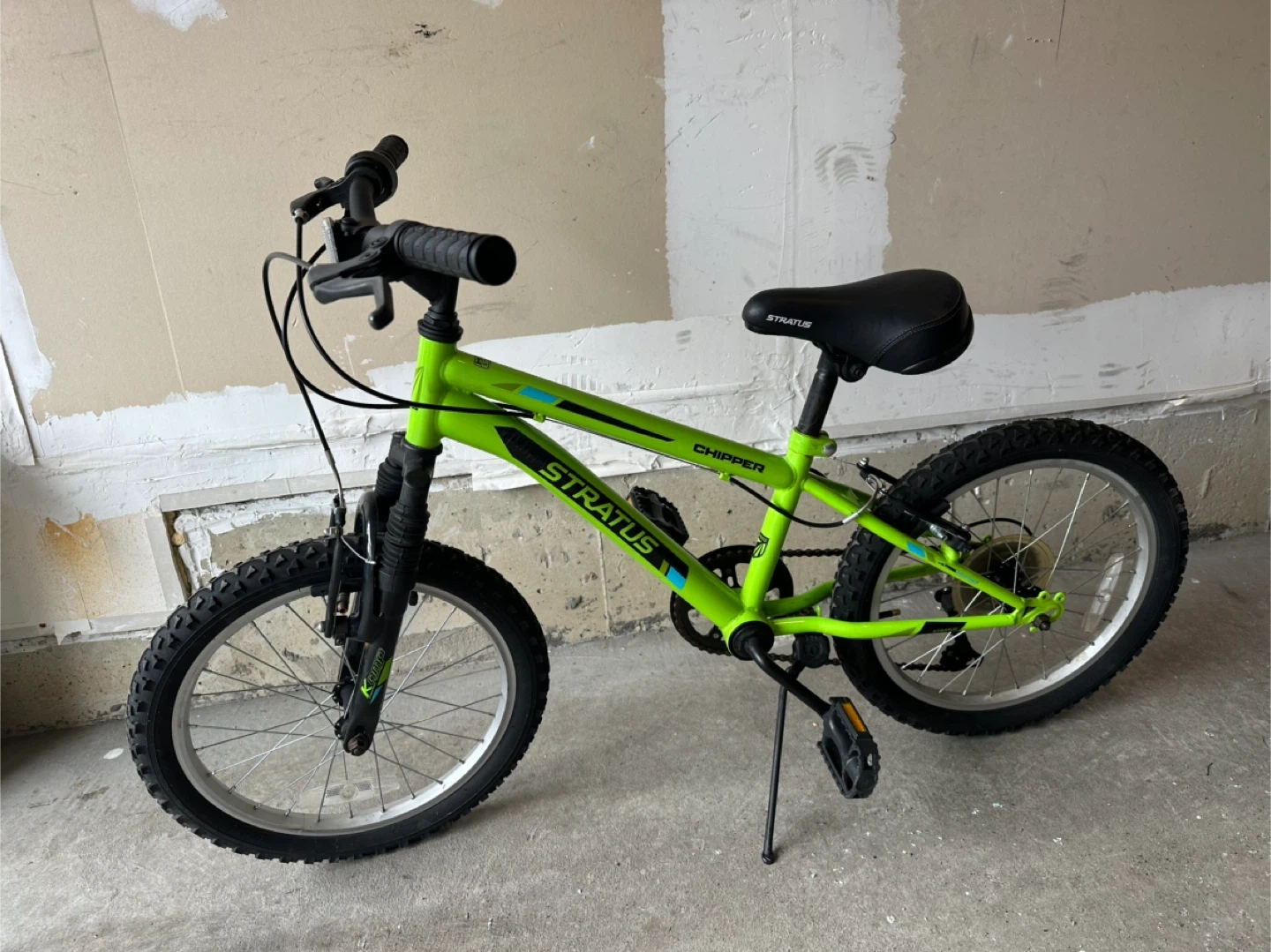 This is a green Stratus Chipper kids bicycle with 18-inch wheels. It has a sturdy frame and front suspension. Comes with hand brakes and a kickstand.