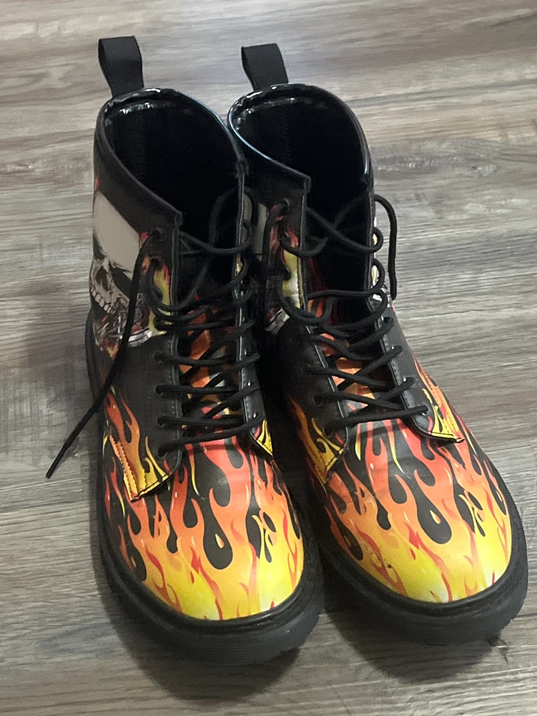 These unisex flaming skull combat boots are for all who are looking for an edgy out of the box look, for Halloween, rock concerts, or just an edgy look it will pimp up your Halloween costume and complete your look