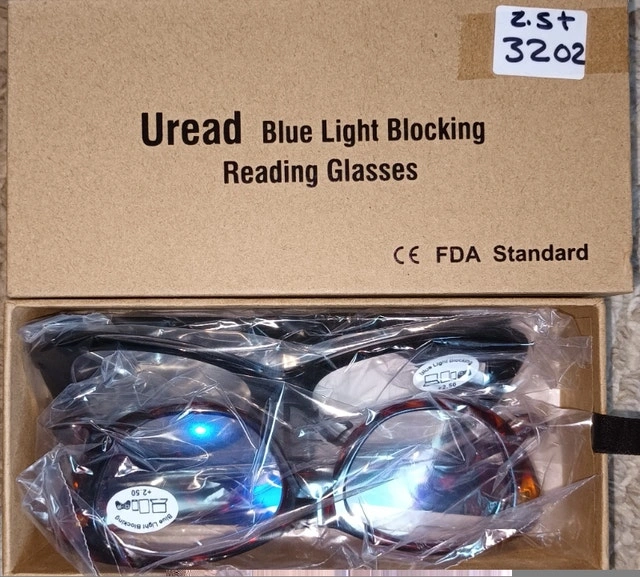 Selling a new pair of Uread reading glasses, strength 2.5+. These glasses feature blue light blocking lenses with UV400 protection and glare reduction, designed to reduce eye strain from screens. They are lightweight, comfortable, and have flexible spring hinges. This is a value pack of 2 pairs, one black and one brown. Perfect for reading, working on the computer, or as a thoughtful gift. Smoke-free home. Pick up only in Summerside.
